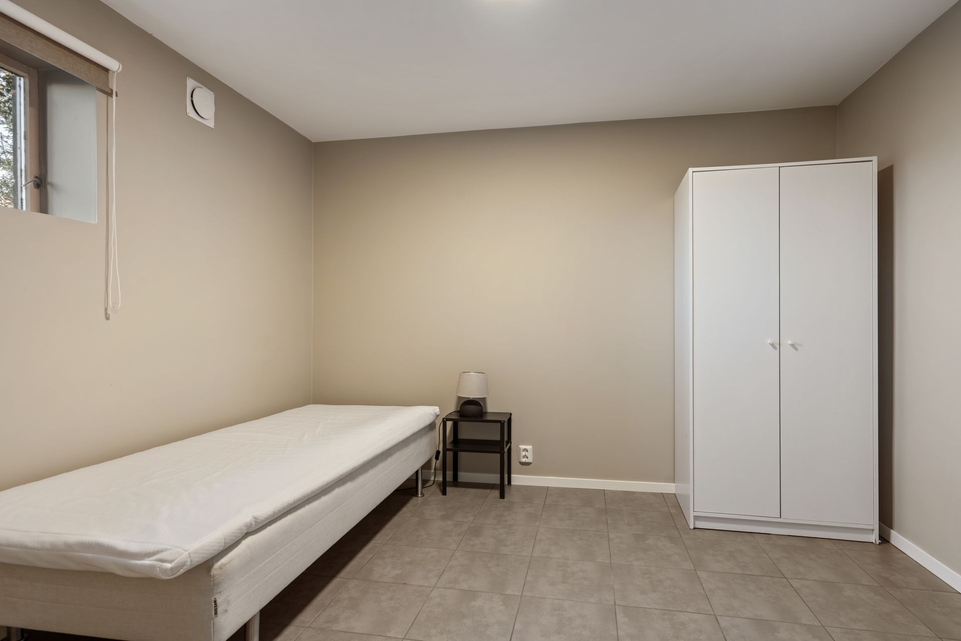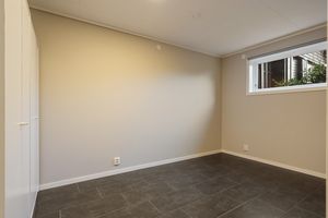 Soverom med rullegardin i vindu, fliselagt gulv med varmekabler, to doble garderobeskap. Ikke godkjent som soverom.