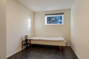 Soverom med fliselagt gulv med varmekabler, rullegardin i vindu og malte vegger. Ikke godkjent som soverom.