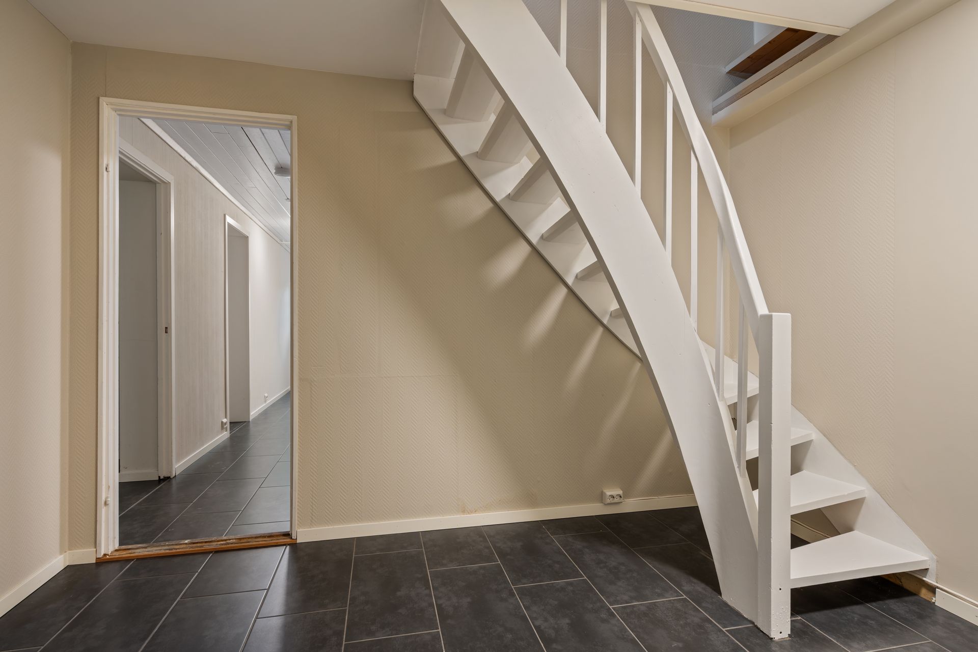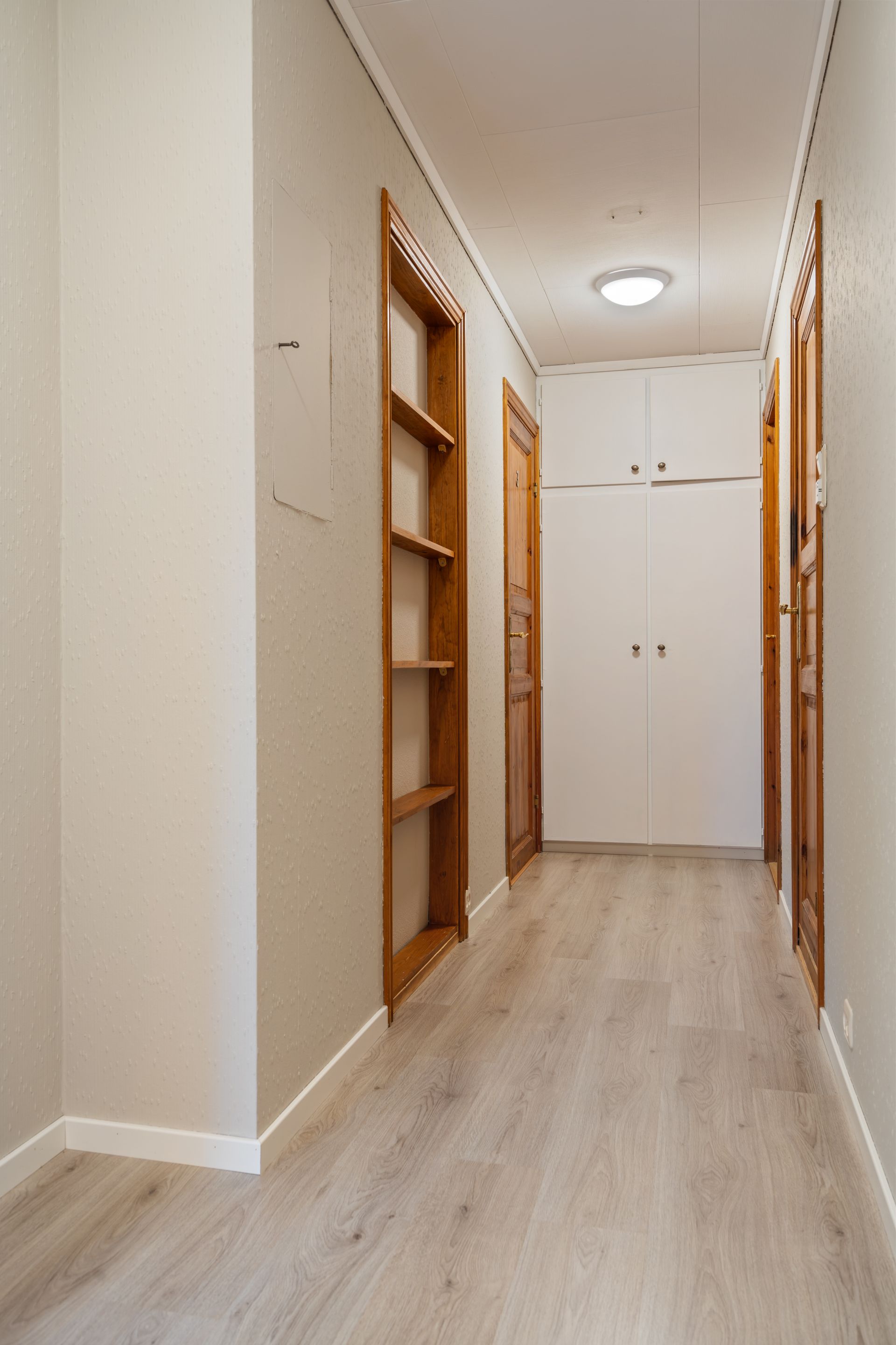 Gang med belegg på gulvet innenfor ytterdøra og nytt laminatgulv i resten av gangen. Trapp opp til loftsetasje og trapperom ned til kjelleretasje. Dobbelt innebygget skap og to småskap over som også er innebygde.
