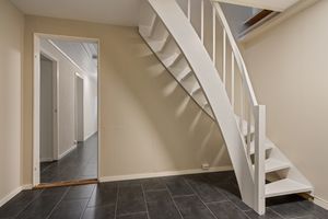 Kjeller: Trapperom ned til gang med fliselagt gulv.