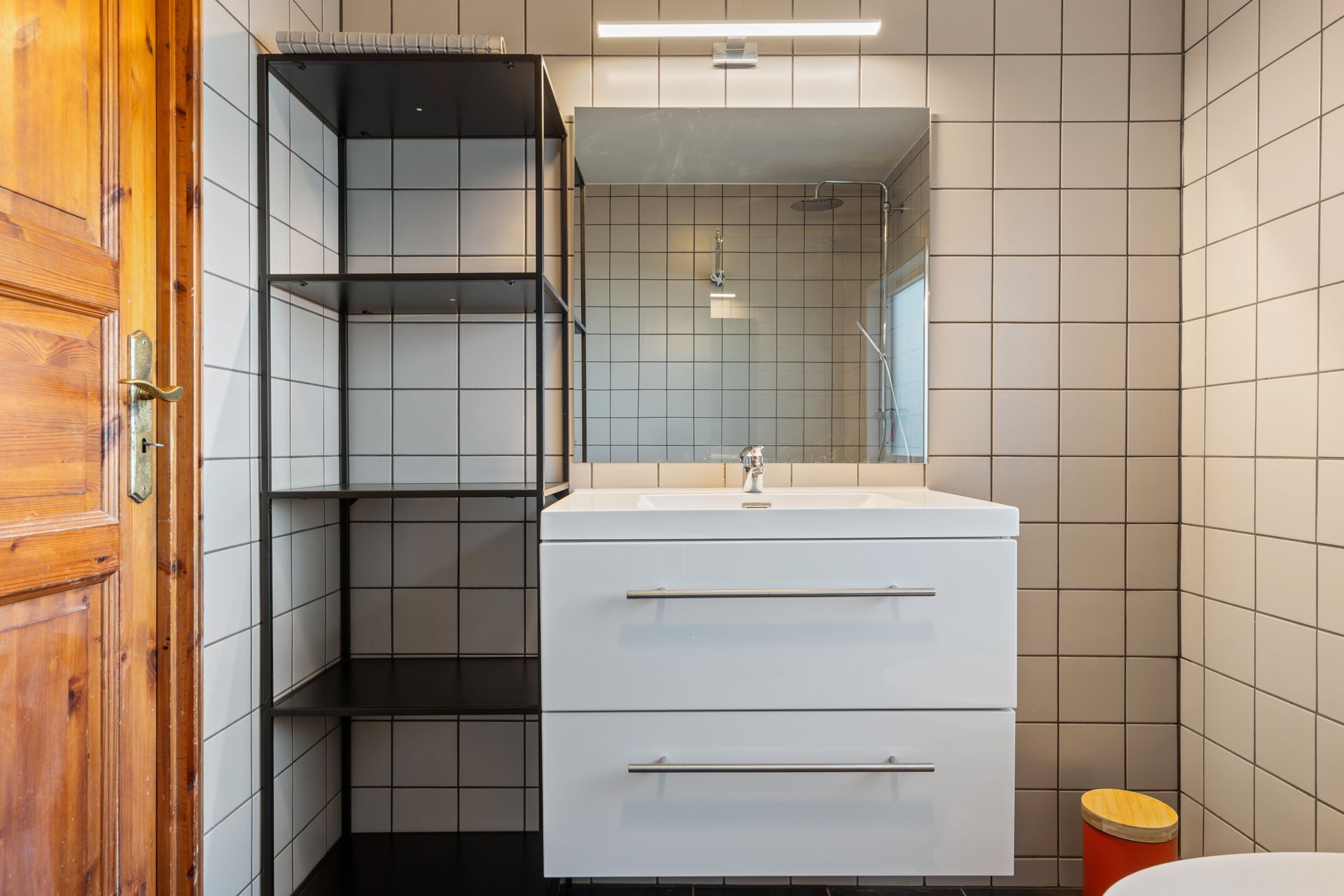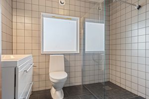 Flislagt bad med varmekabler, baderomsinnredning med dobbel underskuff, wc, elektrisk vifte samt dusjnisje med regnvannsdusj og glassvegg. Pusset opp i 2021. Plastsluk med synlig membran under klemring.