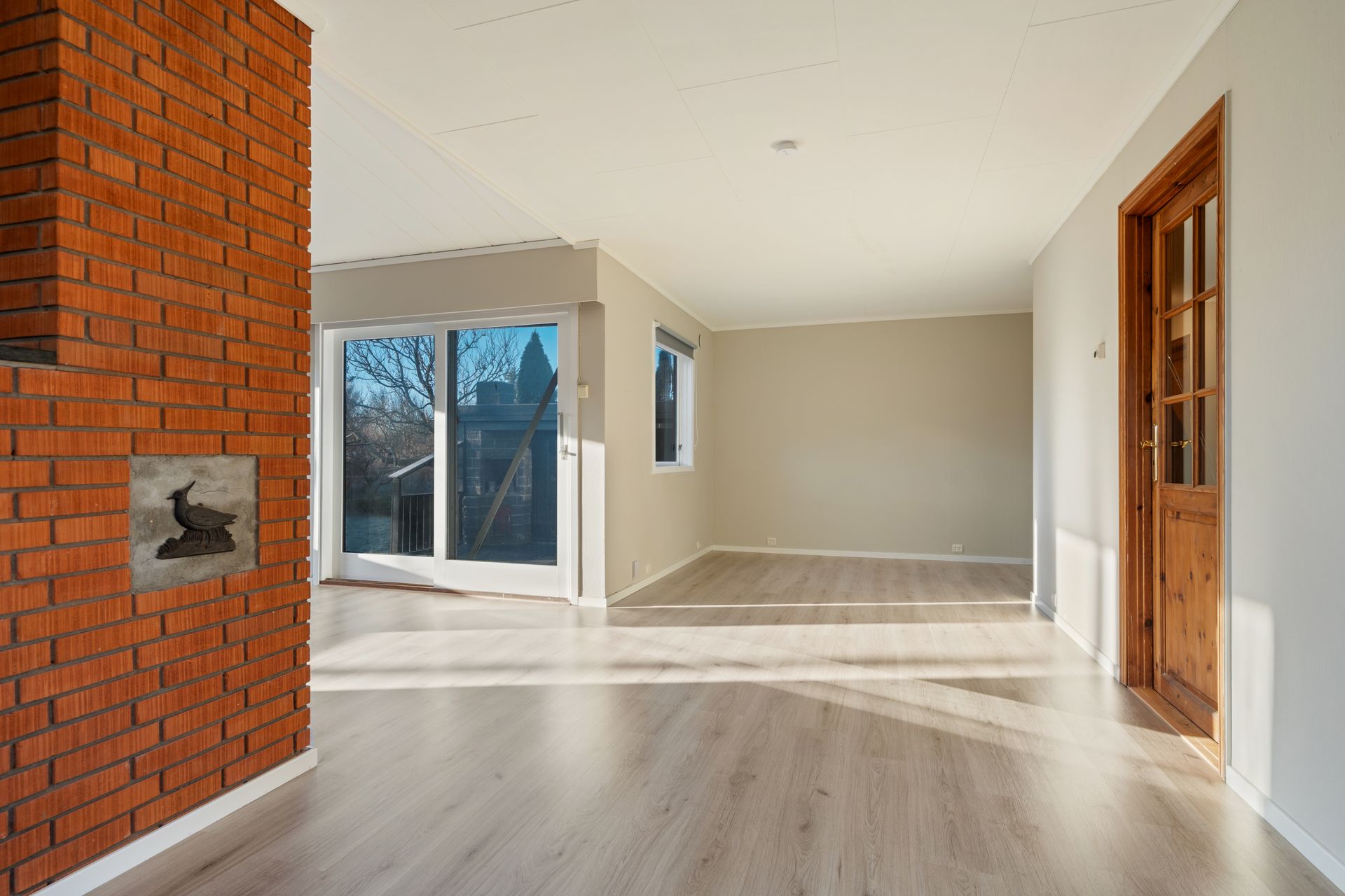 Stue/kjøkken med delvis åpen løsning. Det er nytt laminatgulv og tapetserte vegger. Skyvedør fra stua og ut til romslig flislagt terrasseområde med peis og levegg. Stua har gode møbleringsmuligheter med plass til TV gruppe, finstue og spisestue. Stua har ellers både varmepumpe og peisovn med innsats.