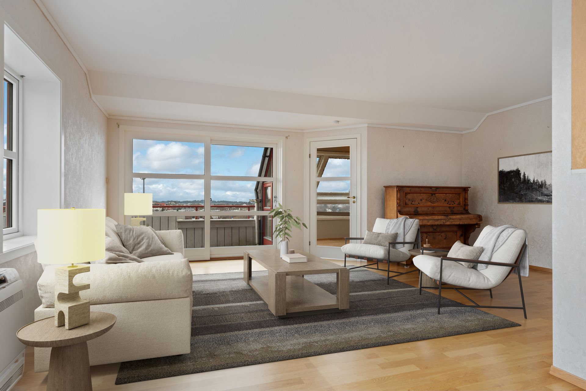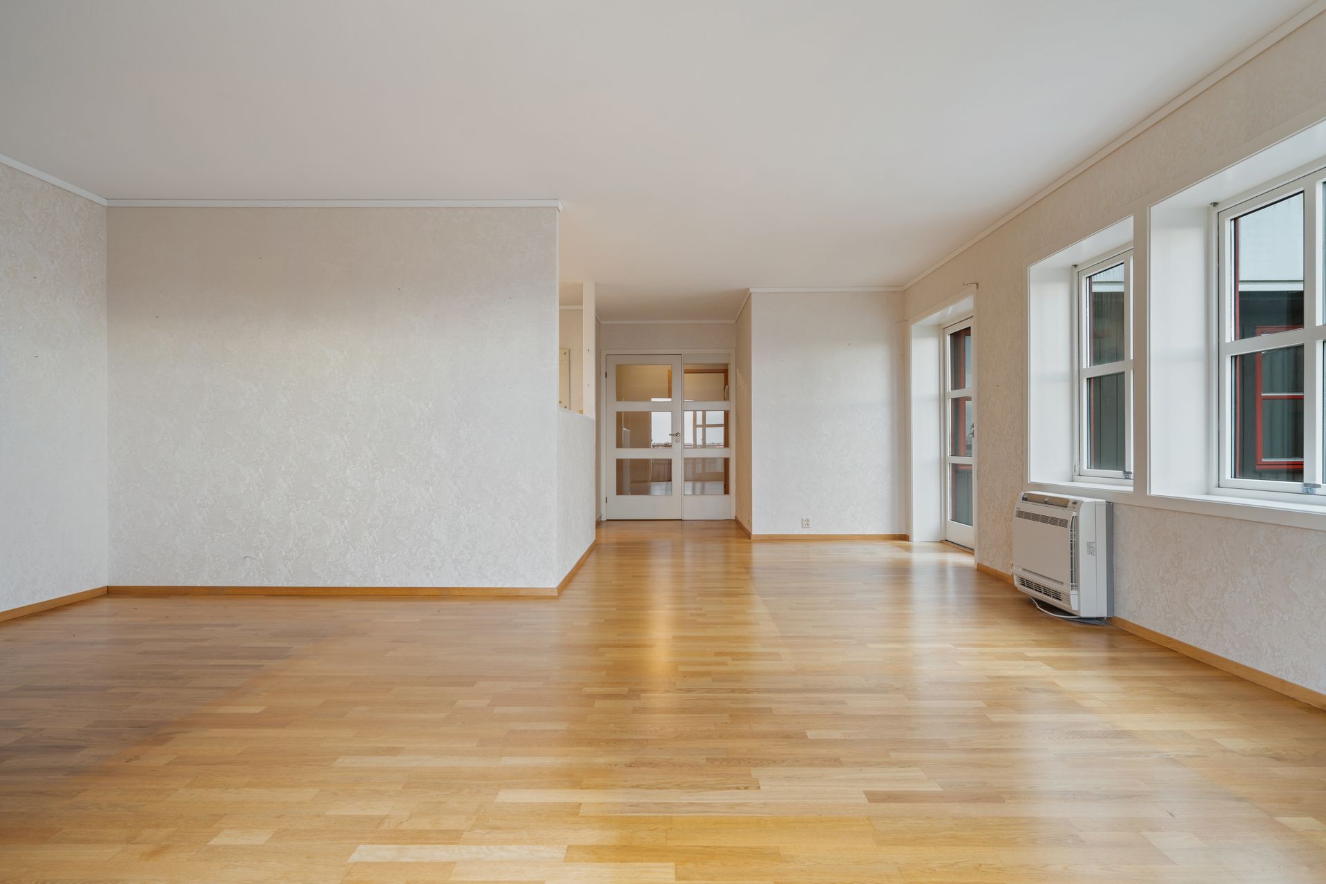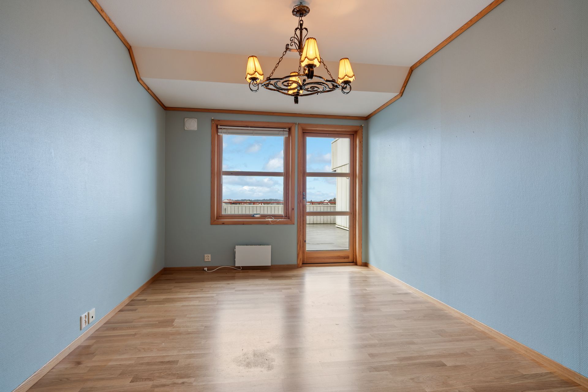 Varmepumpe i stuen. For øvrig elektrisk oppvarming. I de rom hvor det på visning ikke er montert panelovner, vil det heller ikke medfølge i handelen.