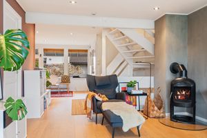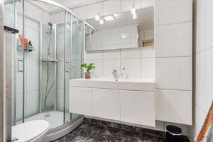 Boligen har innvendig god standard med fint kjøkken m/integrerte hvitevarer, lys og luftig stue m/vedovn og varmepmpe og utgang terrasse. Flislagt wc i hovedetasjen, flislagt bad nede og fine mosaikkfliser på gulvet i vaskerom.