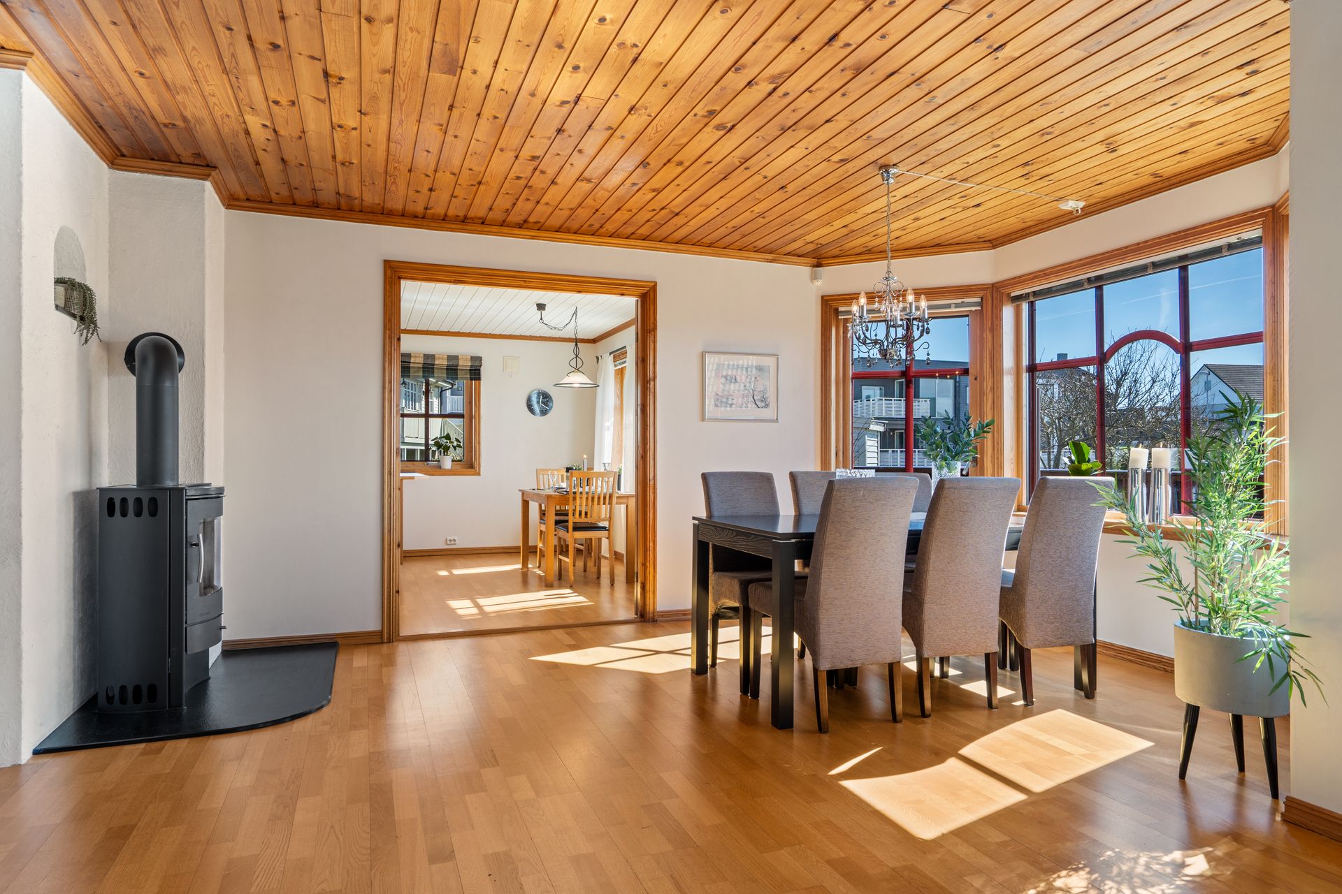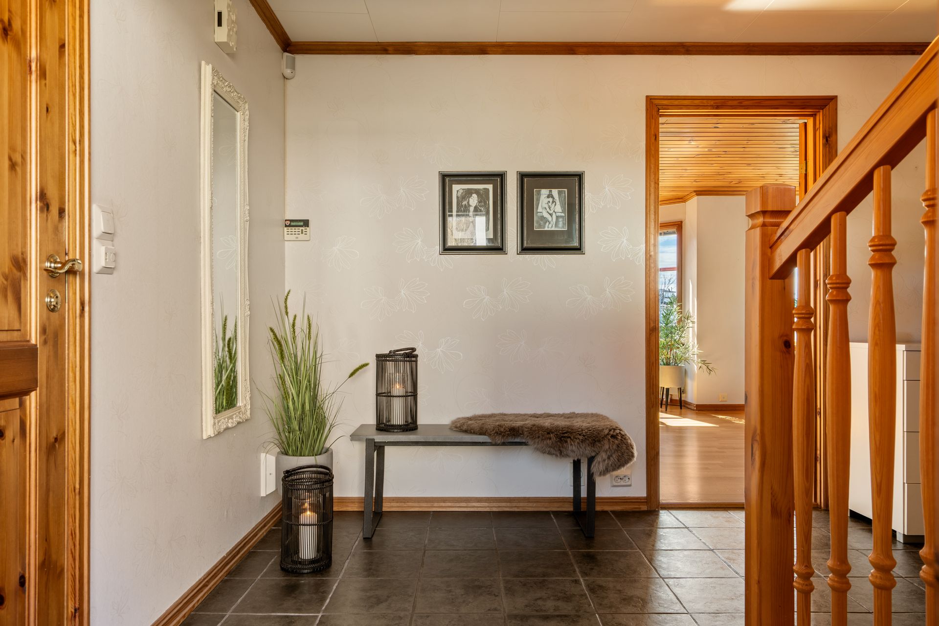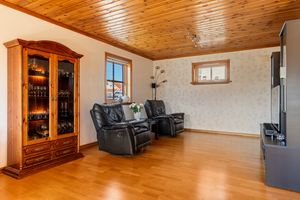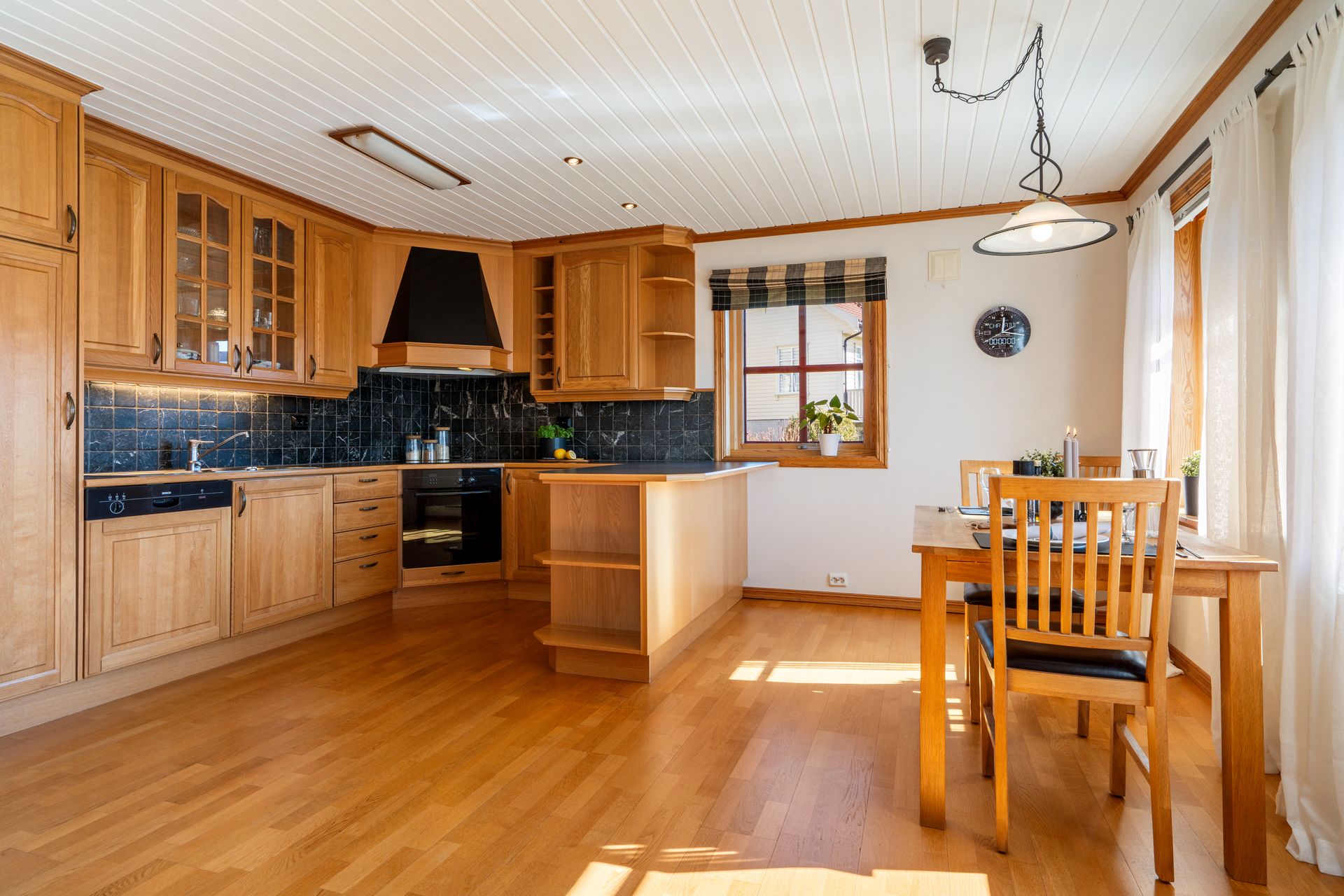 Innvendig: -Første etasje: -Romslig gang med gode oppbevaringsmuligheter. -Bad med tilkomst fra gang. Badet inneholder dusjkabinett, toalett og nyere baderomsmøbel med oppbevaring. Videre fra badet er et praktisk vaskerom m/bi-inngang - perfekt for barnefamilier. -Svært romslig vinkel stue med halvåpen løsning (to- fløyet dør til kjøkkenrommet). God plass til ønsket møblement og rikelig med dagslys gjennom vinduer. I originale bygningstegninger er det stiplet linje ved tv-kroken dersom man har behov for et soverom i hovedetasjen også. Varmepumpe og vedovn som oppvarmingskilder. -Kjøkken rom av god størrelse med mulighet for å skille mellom stue/kjøkken med dør. Romslig kjøkken med god plass til spisegruppe. Kjøkkeninnredning i heltre med integrerte hvitevarer - med god benke og skapplass.