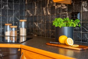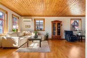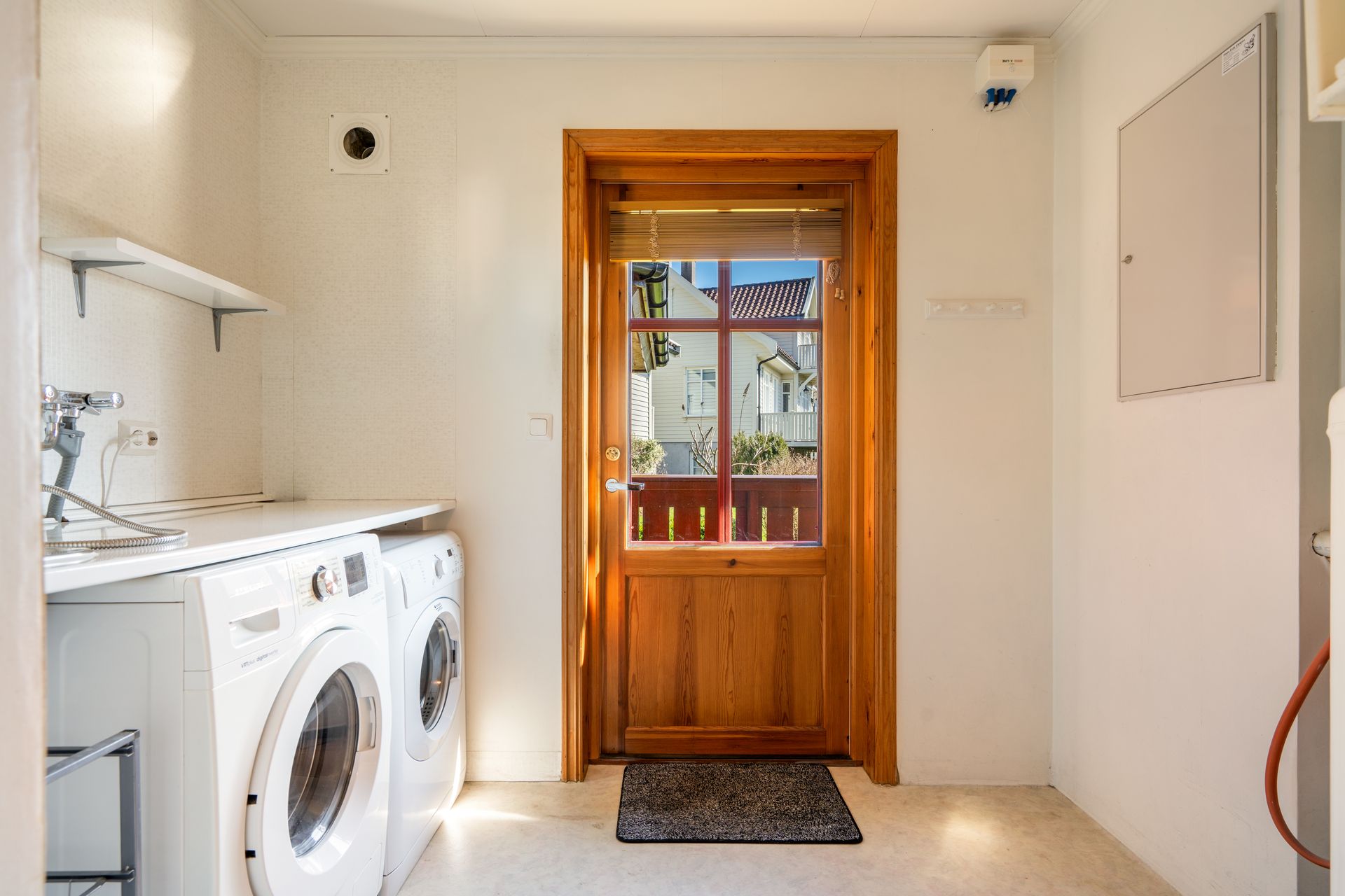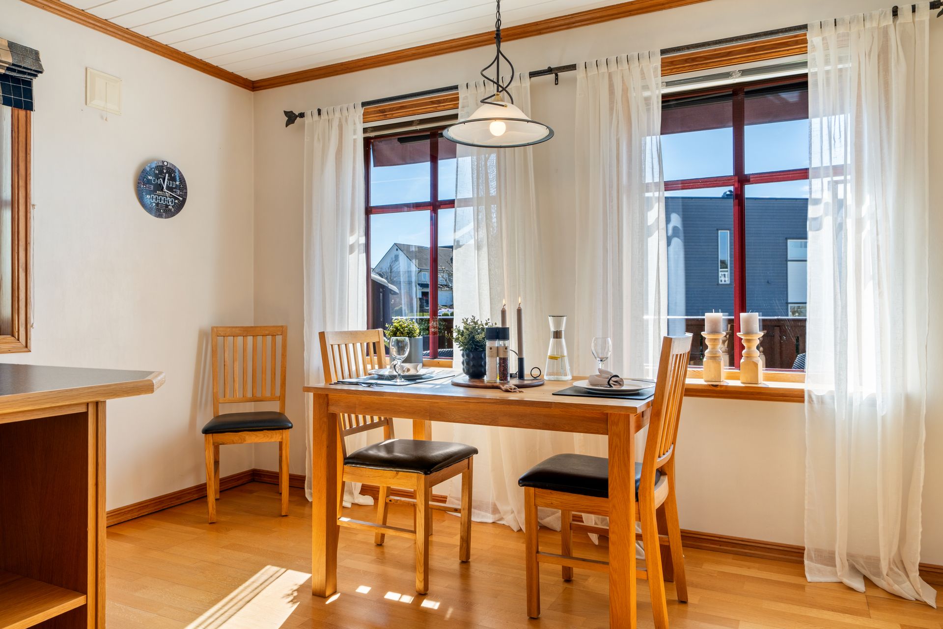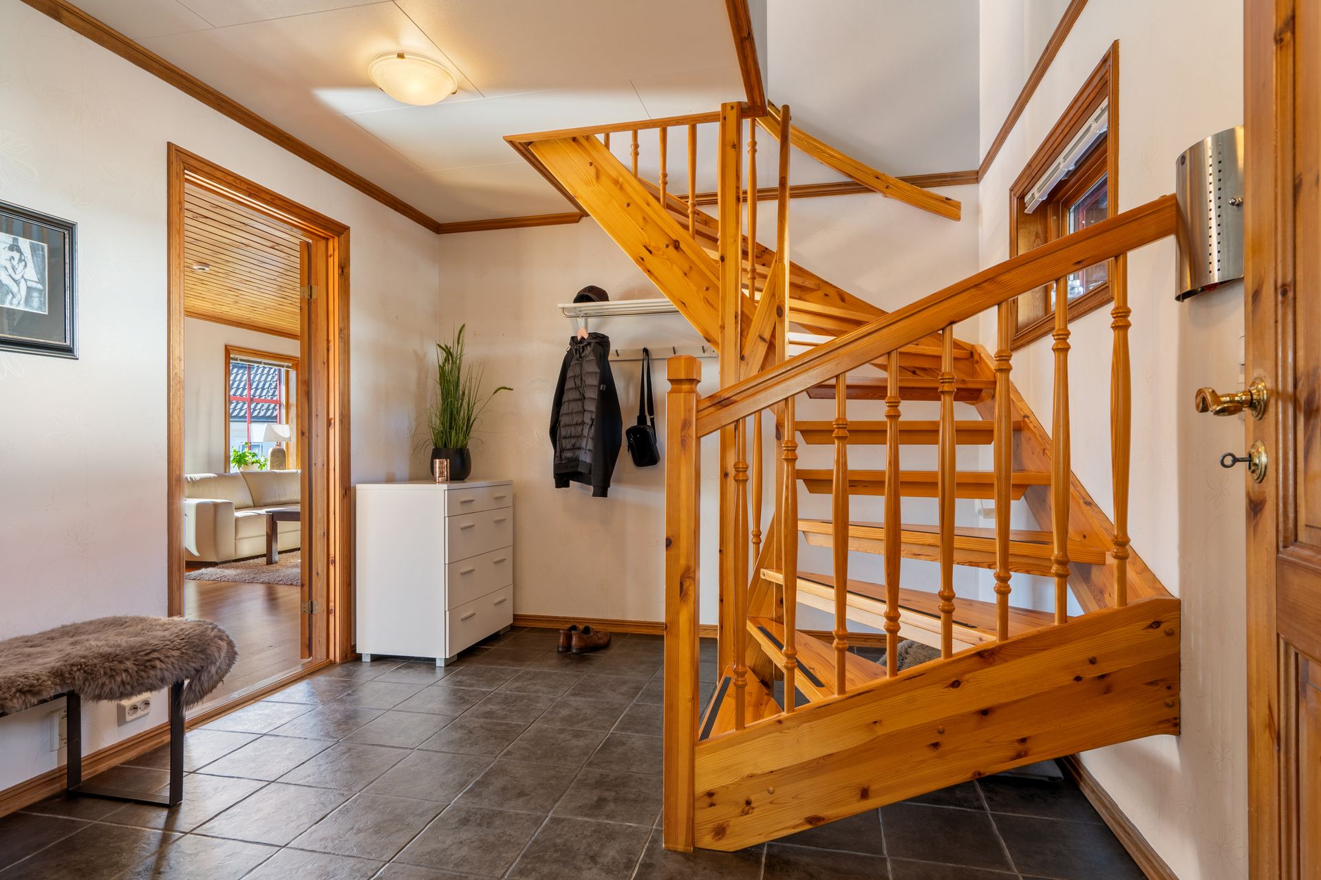 Innvendig: -Første etasje: -Romslig gang med gode oppbevaringsmuligheter. -Bad med tilkomst fra gang. Badet inneholder dusjkabinett, toalett og nyere baderomsmøbel med oppbevaring. Videre fra badet er et praktisk vaskerom m/bi-inngang - perfekt for barnefamilier. -Svært romslig vinkel stue med halvåpen løsning (to- fløyet dør til kjøkkenrommet). God plass til ønsket møblement og rikelig med dagslys gjennom vinduer. I originale bygningstegninger er det stiplet linje ved tv-kroken dersom man har behov for et soverom i hovedetasjen også. Varmepumpe og vedovn som oppvarmingskilder. -Kjøkken rom av god størrelse med mulighet for å skille mellom stue/kjøkken med dør. Romslig kjøkken med god plass til spisegruppe. Kjøkkeninnredning i heltre med integrerte hvitevarer - med god benke og skapplass.