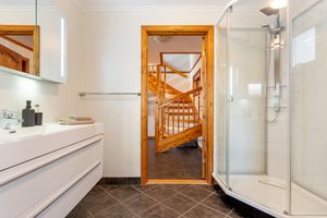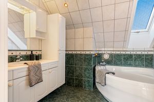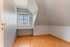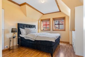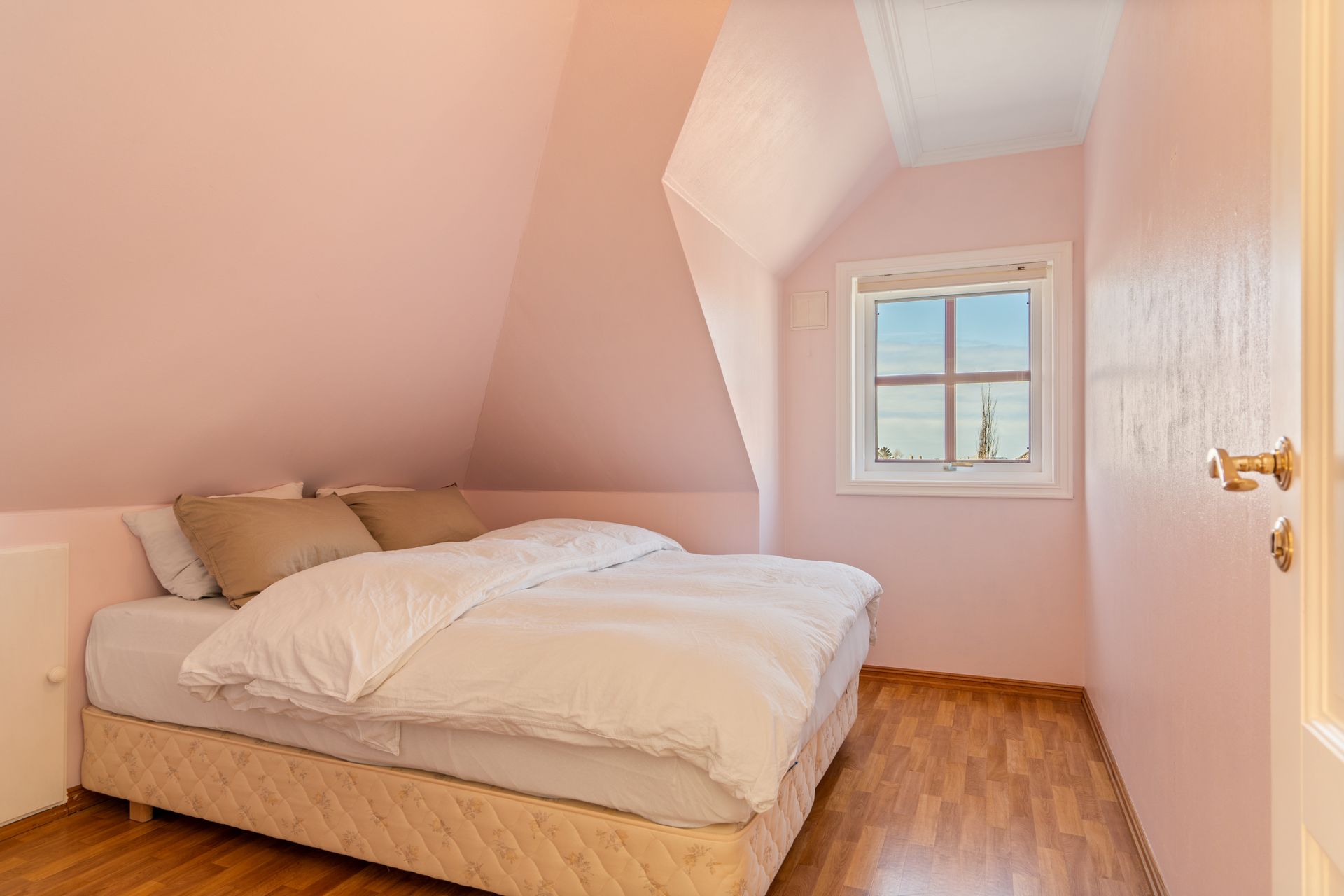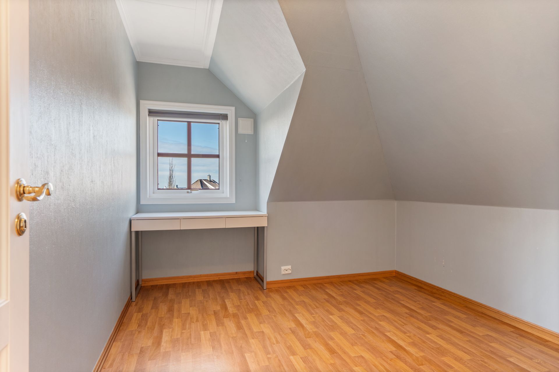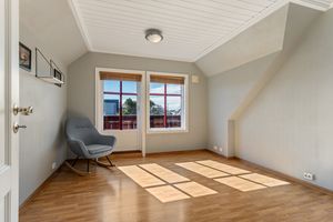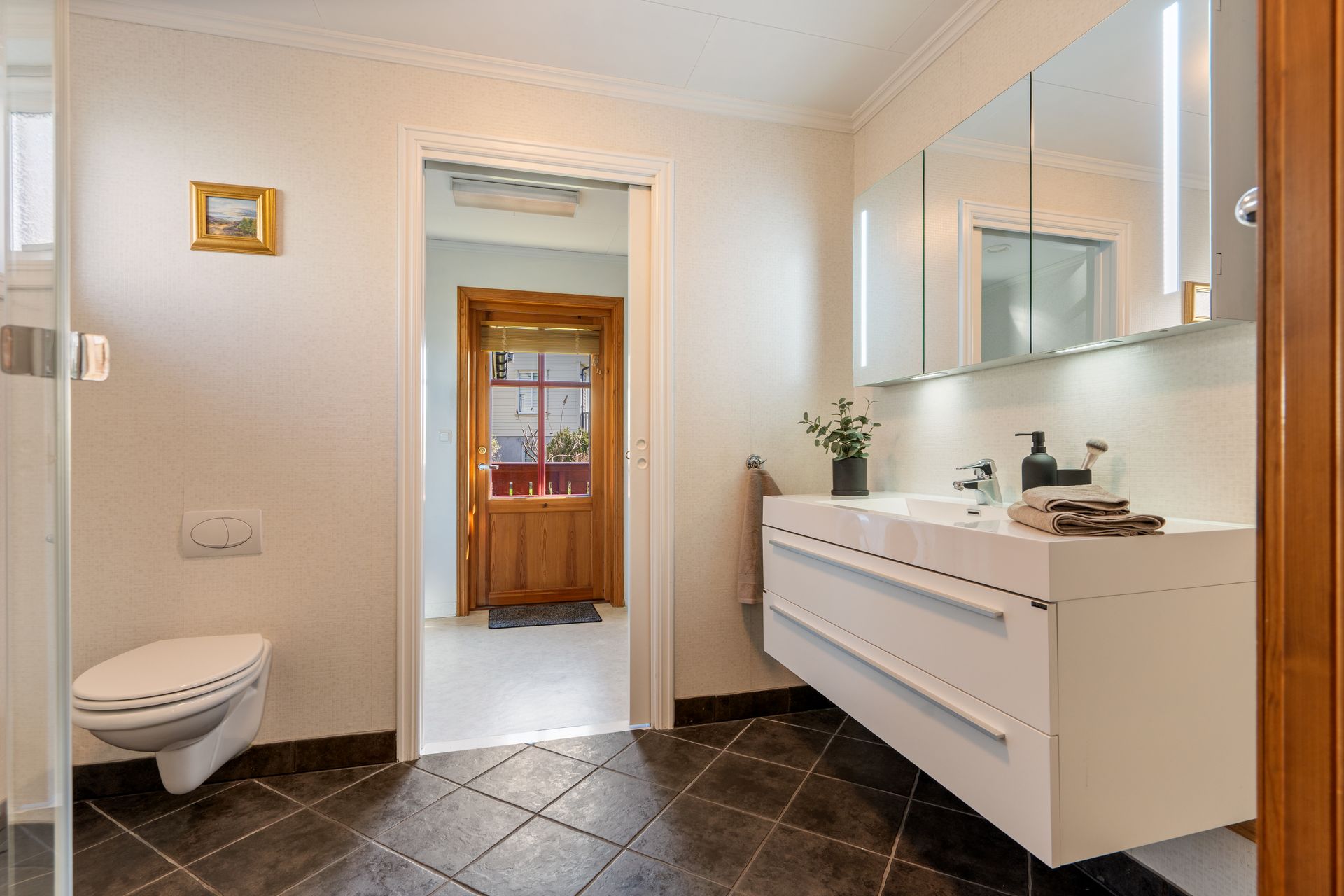 -Andre etasje: -3 kjekke soverom, hvorav hovedsoverommet er av ekstra god størrelse, med oppbevaring i egen "walk-in løsning" og bod i eget rom bak sengen. -Helfliset baderom som inneholder badekar, servantskap med god skap plass og toalett. Varmekabler i gulv.