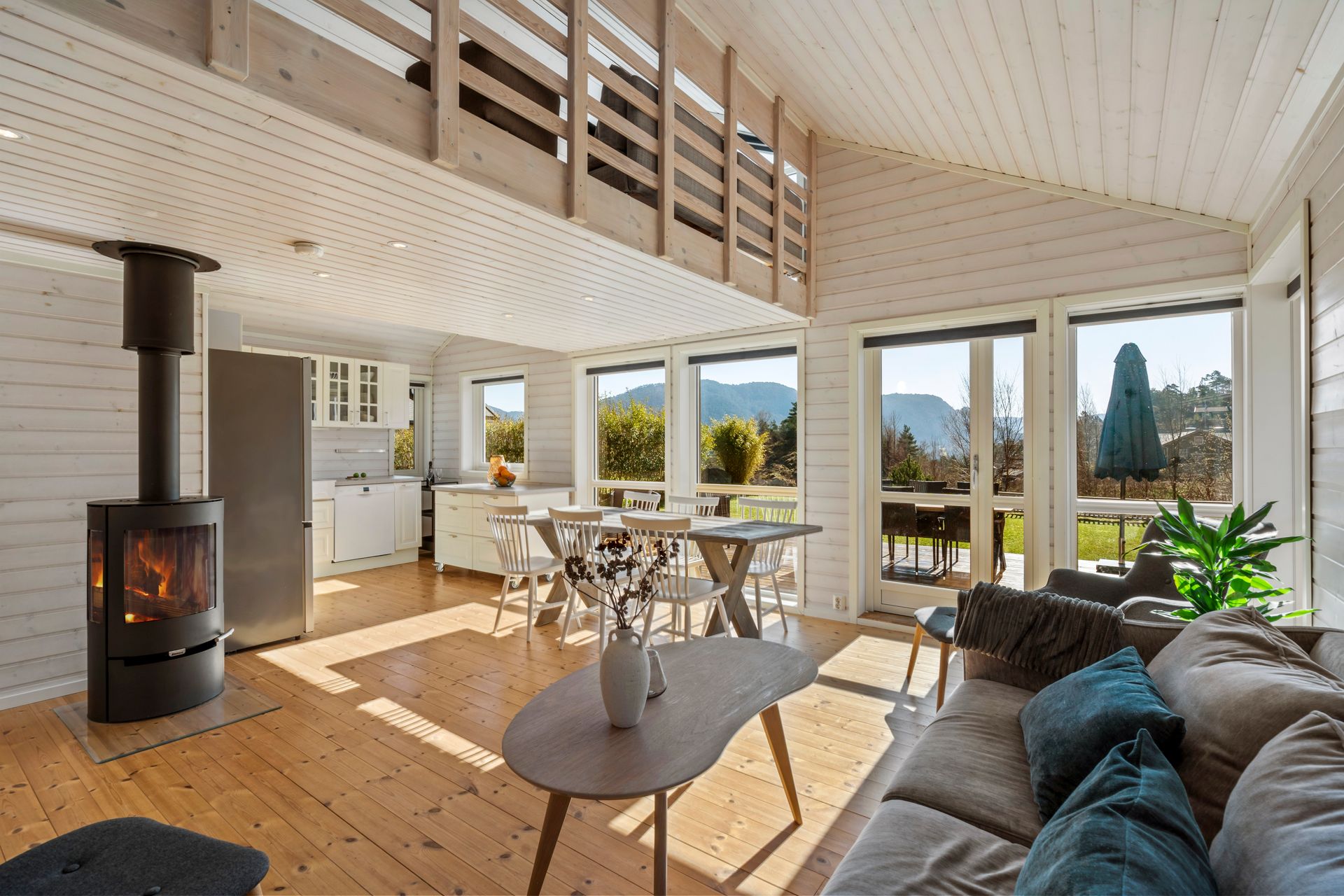 Romslig stue i åpen løsning med kjøkken. Stua har gode vindu som gir deilig lys, god vedovn og god plass til spisegruppe og salong. Spotter i tak. Fra stuen er det utgang til nybeiset terrasse og hage.