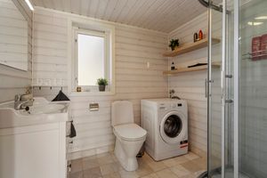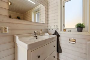 Flott baderom med pen baderomsseksjon, speil, dusj og wc. Opplegg for vaskemaskin. Baderom har fliser på gulv og panel på vegger og i tak. Varme i gulv.