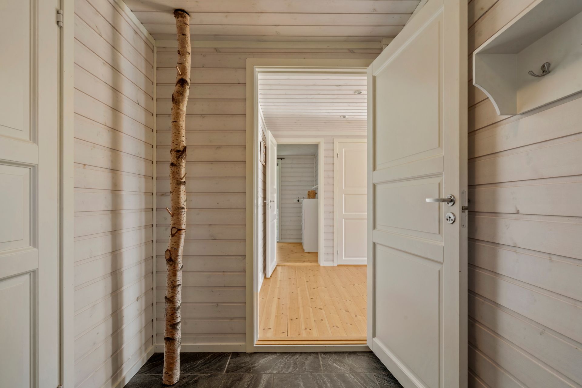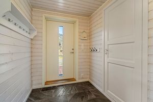 Hovedplan: Lys, pen entrè med fliser på gulv. Varme i gulv.
