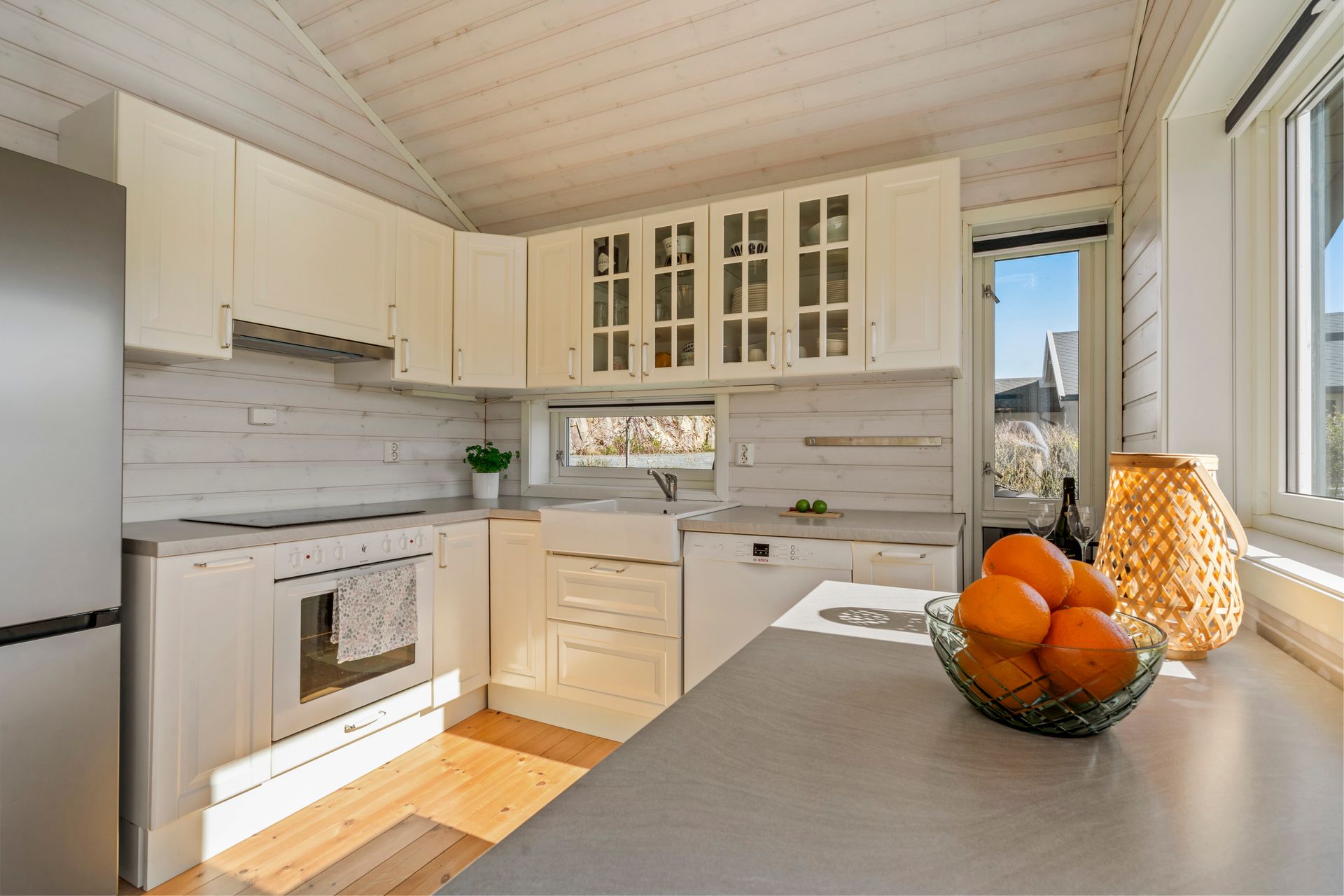 Lyst, pent kjøkken med god skap- og benkeplass. Praktisk frittstående kjøkkenseksjon på hjul som lett kan flyttes etter eget ønske og behov. Integrert komfyr og koketopp, samt kjøleskap m/ frys og oppvaskmaskin medfølger i handelen.