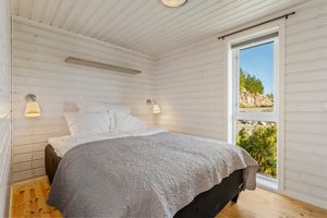 Pen, smakfullt innredet hytte med fin utsikt og båtplass. Sommerparadis for store og små!