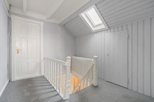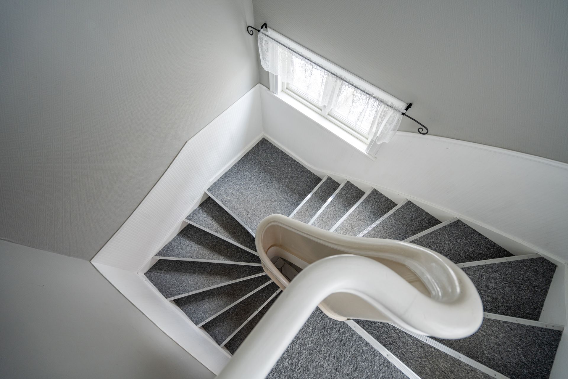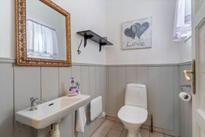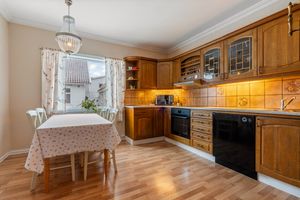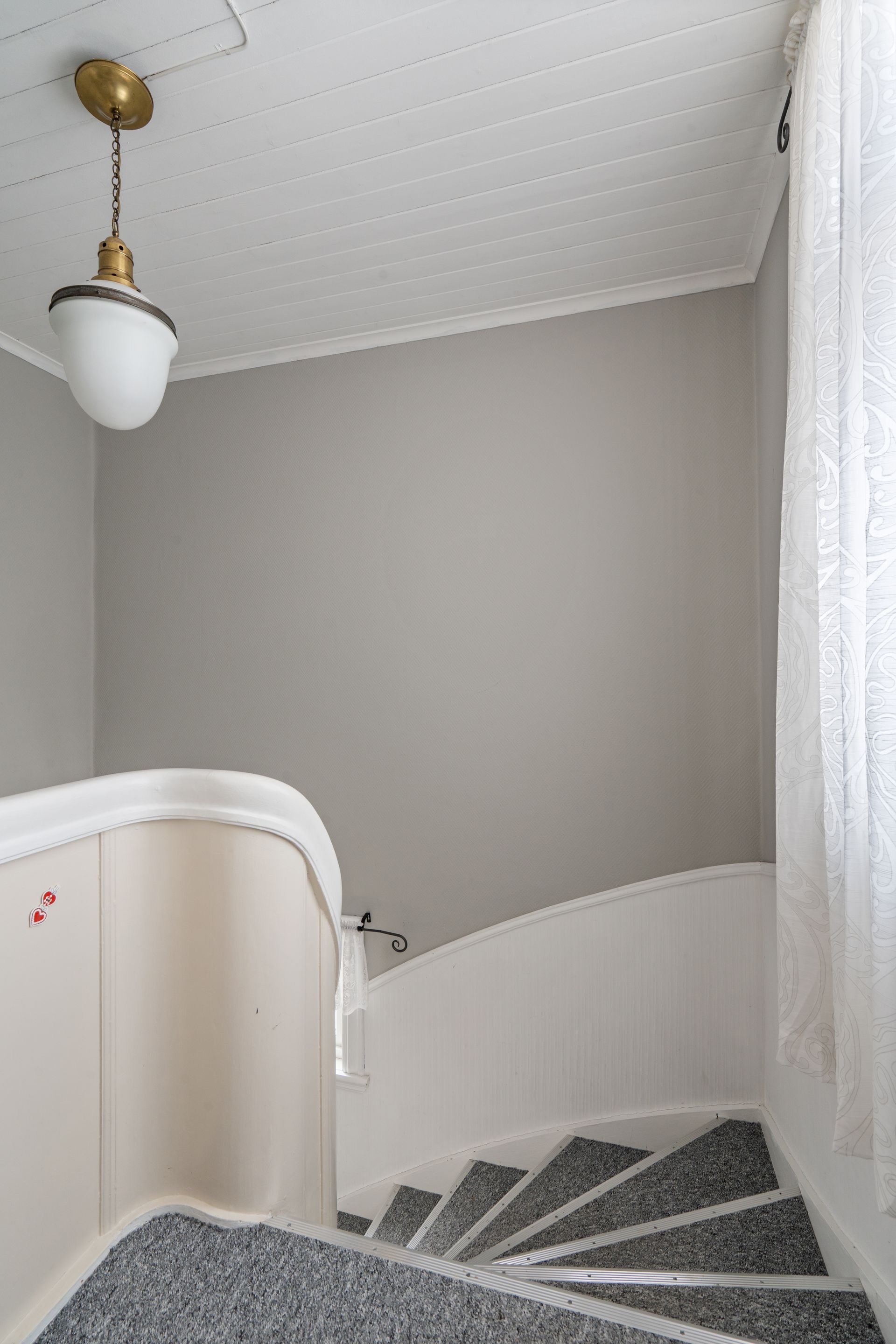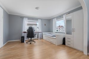 Boligdel: Boligdelen går over tre plan og holder en familievennlig og romslig standard. I 1. etasje finnes inngangsparti med hall, bod og garasje. 2. etasje byr på gang, toalett, vaskerom, kjøkken og en stor og hyggelig vinkelstue med gode oppholdssoner. Loftsetasjen inneholder gang, bad, bod, to soverom samt tre garderoberom/mindre rom som i dag benyttes som soverom, noe som gir fleksible bruksmuligheter.