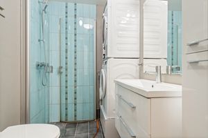 Bad med fliselagt gulv m/varmekabler, dusjnisje med svingdører og flislagte vegger, vegghengt toalett, vaskemaskin og tørketrommel som medfølger kjøpet, moderne servant med dobbel underskuff og høyt sideskap, lys over speil og rør-i-rør skap integrert i vegg. Rommet er ventilert via avsugsventil vegg og tilluft under dørblad.