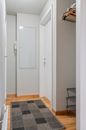 Inngang til gang med åpen løsning inn til stue og kjøkken. Garderobeløsning ved inngangsdøra. Panelovn.