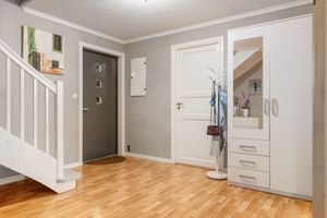 Bolig har i all hovedsak laminat og belegg på gulv. Baderom i hovedetasjen og 2. etasje har fliser på gulv og våtromstapet på vegg. Bad i sokkelleilighet har våtromsbelegg på gulv og tapet på vegg. Malte og tapetserte vegger. Malte plater i tak.