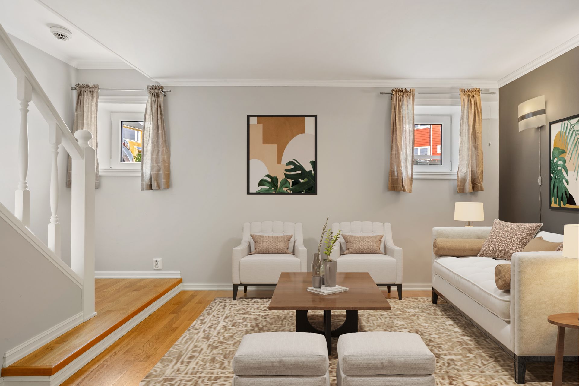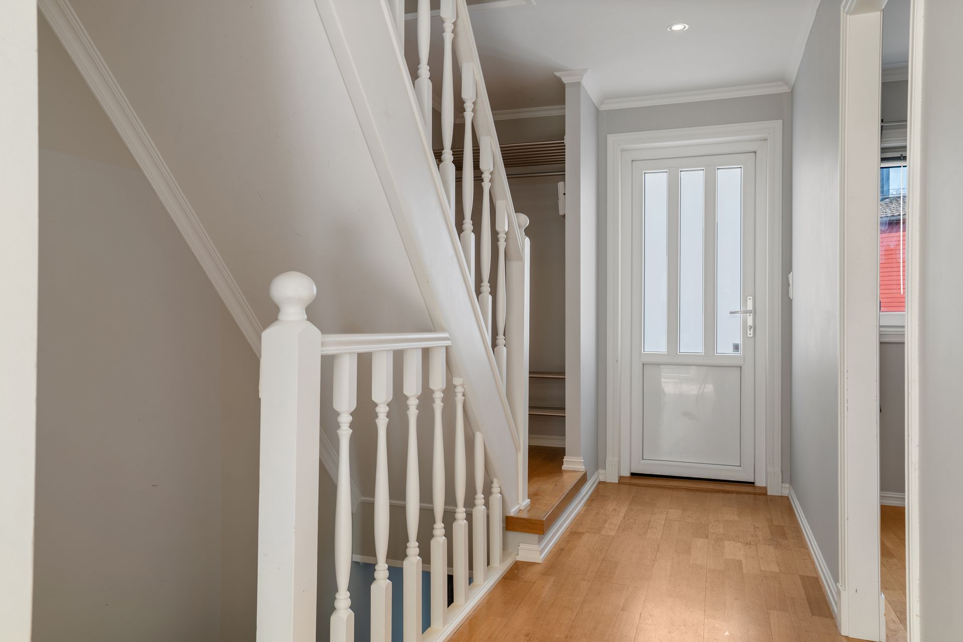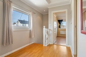 - Etasje: Det er eiketrinn i den nydelige hvitmalte trappa opp til gang med plass til kontorpult og et helt nytt vindu.