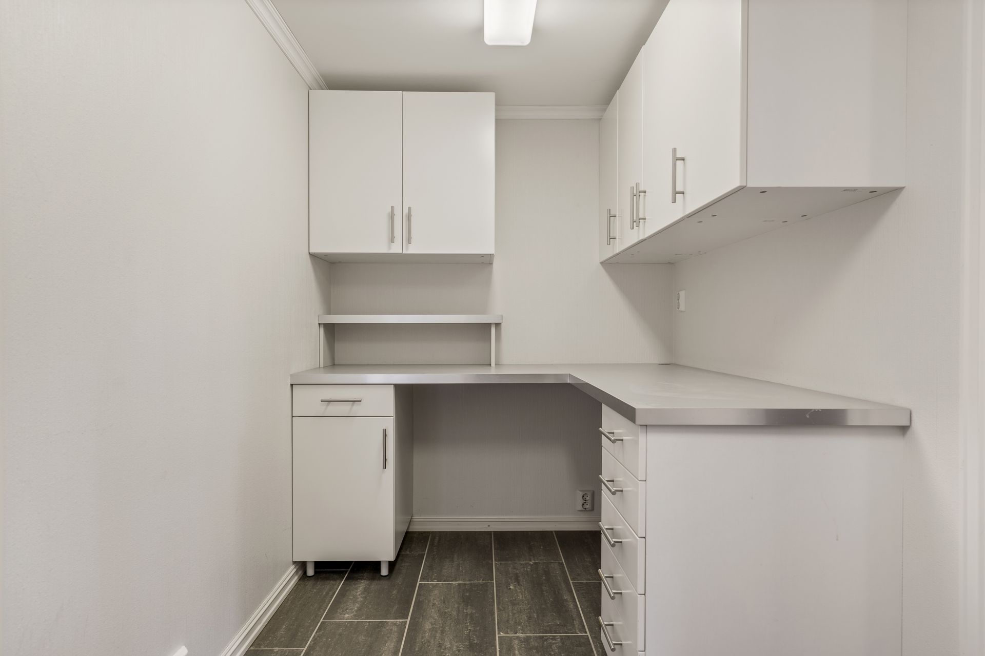 Stor og god bod med fliser på gulv. Boda har både hjørneseksjon med benkeplate og seks overskap, underskuffer, ekstra benkeplate med dobbelt underskap i den andre enden av rommet inkl. dobbelt overskap og dobbelt garderobeskap.