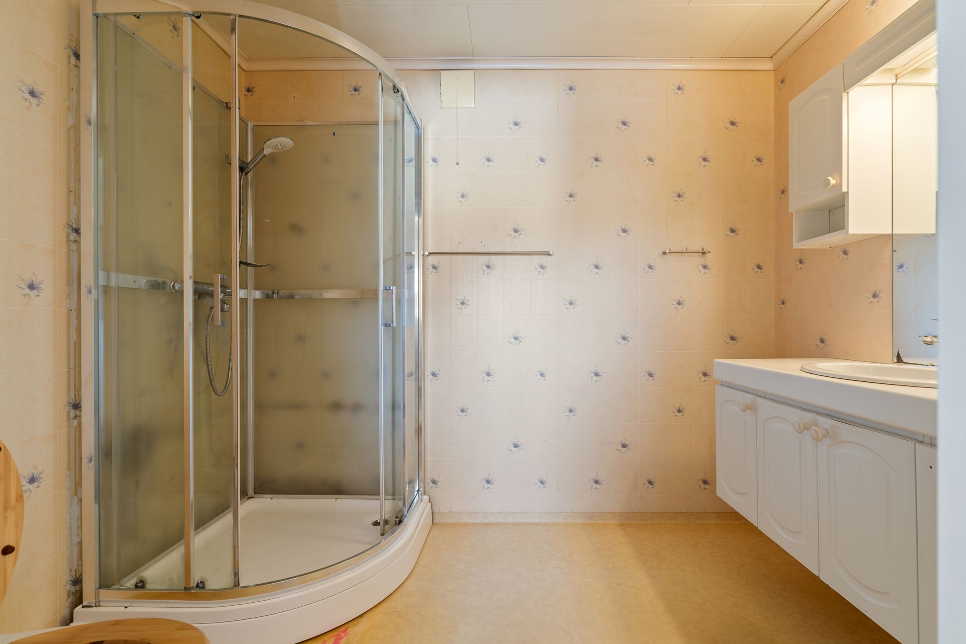 Bad med belegg på gulv, wc, dusjkabinett, stråleovn, baderomsinnredning med 4 underskuffer, dobbelt speilskap og plass til stellebord.