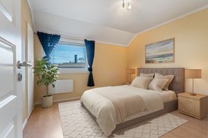 Dobbelt soverom med laminatgulv, panelovn og kott.