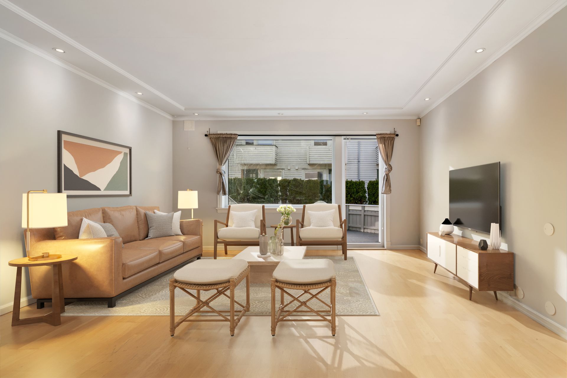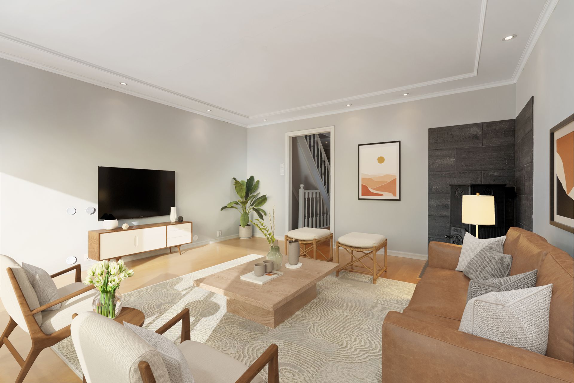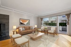 Stue med utgang til terrasse, Jøtul vedovn, spotter i taket, eikeparkett på gulv og nymalte vegger. Utgang fra stua til romslig terrasse mot vest og port med trapp ned til plen samt skillevegger mot nabo.