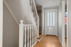Inngang - nord: Inngang til gang m/garderobe og med trapp opp til loftsetasje og trapp ned til kjeller. Eikeparkett på gulv. Det er også samme type eikeparkett uten terskler inn til stue og til kjøkken.