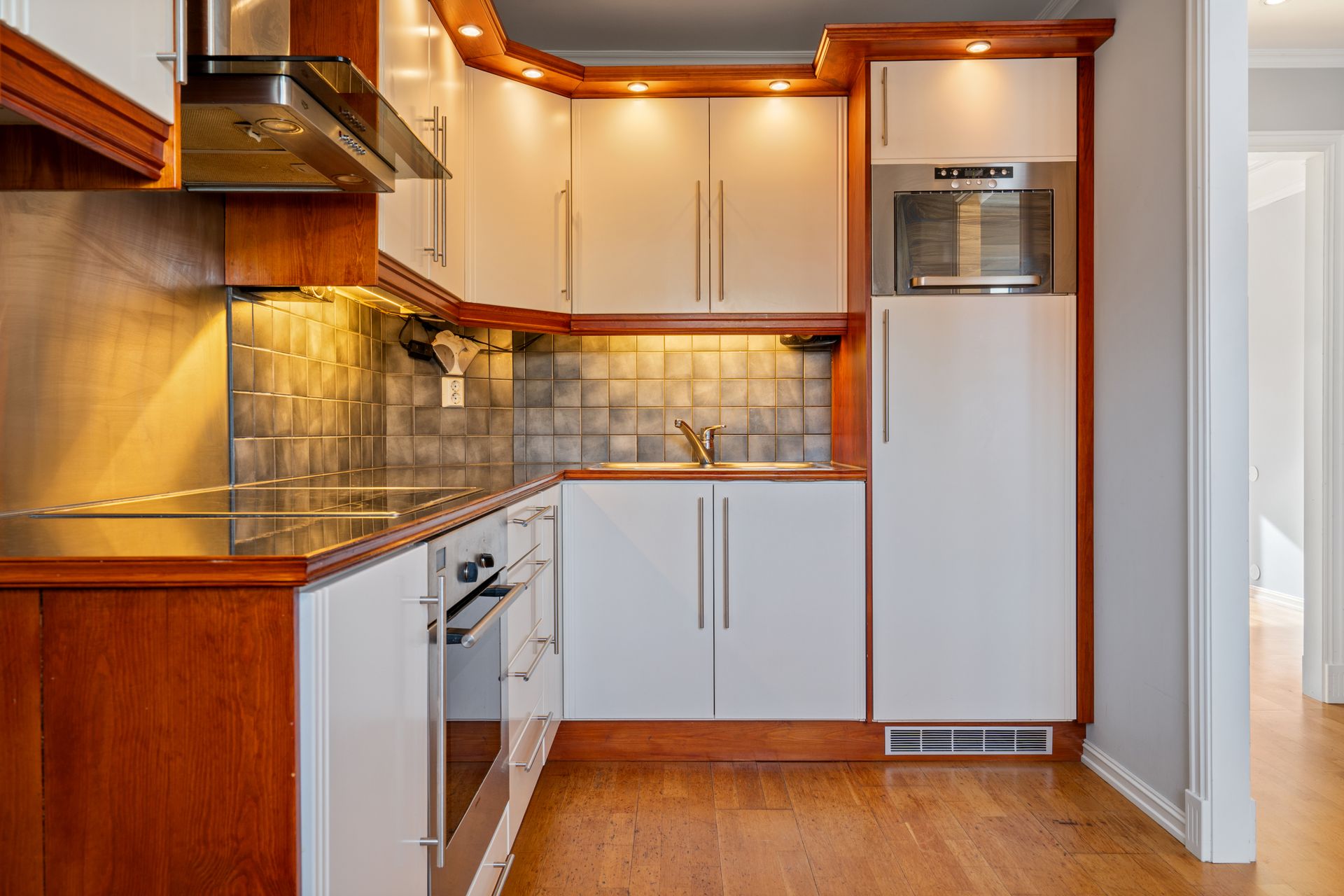 Kjøkken har dobbel vask nedfelt i laminatbenkeplate med spotter over benkeplata, keramisk koketopp, int. stekeovn, int. kjøleskap og int. micro. Det er ikke oppvaskmaskin per i dag, men mulig å montere det. Det er også vakker belysning inne i innredningen, fliser over benkeplata og spruteplate over komfyren.