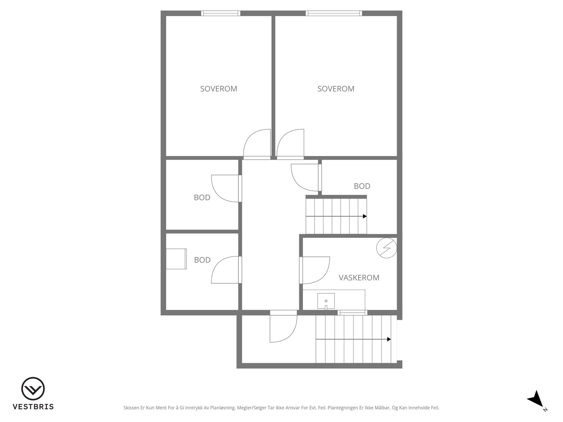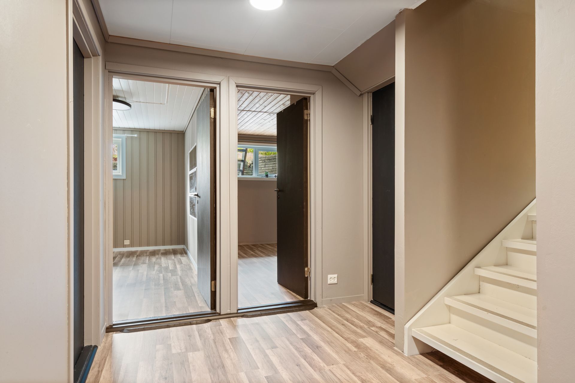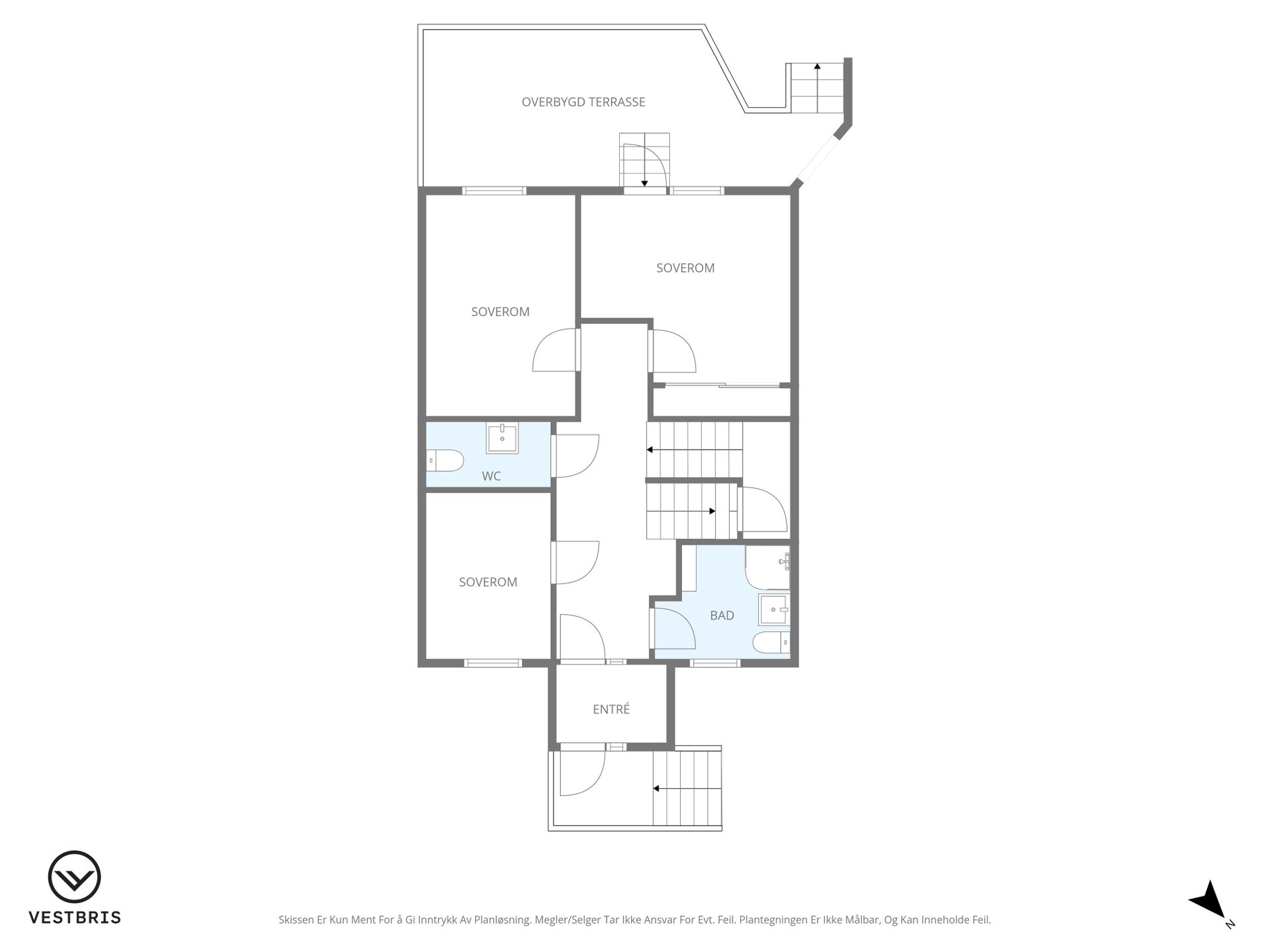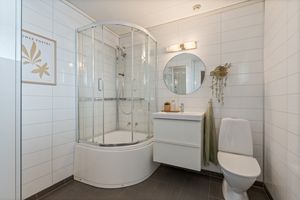 Første etasje: -Vindfang med muligheter for oppbevaring av yttertøy. -Gang -Lyst og tidløst bad som inneholder: toalett, kombinert badekar/dusj kabinett, servantskap med oppbevaring og høyskap. -Praktisk gjestetoalett. -3 soverom, hvorav hovedsoverommet er svært romslig med garderobe og direkte adkomst til terrasse/hage.