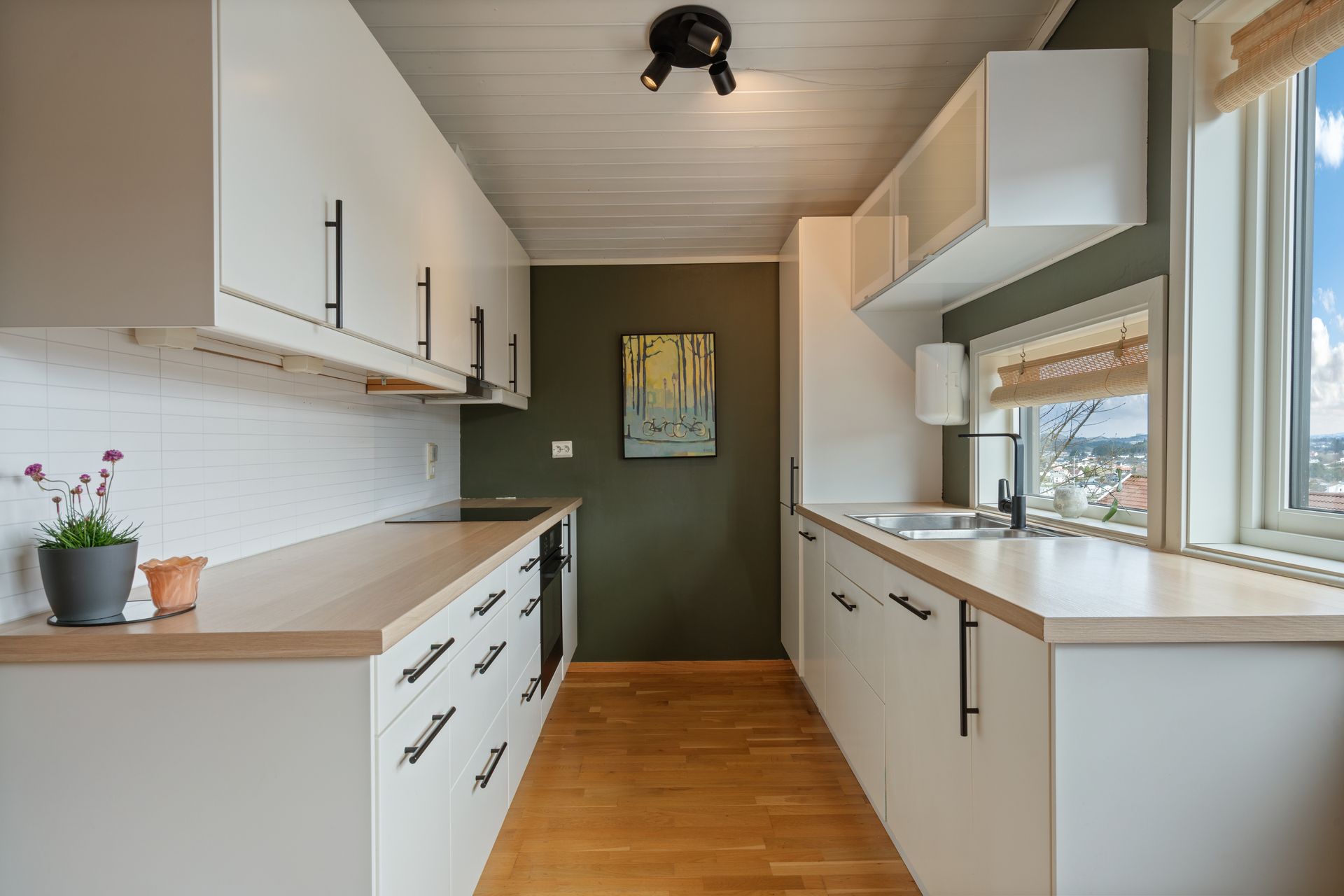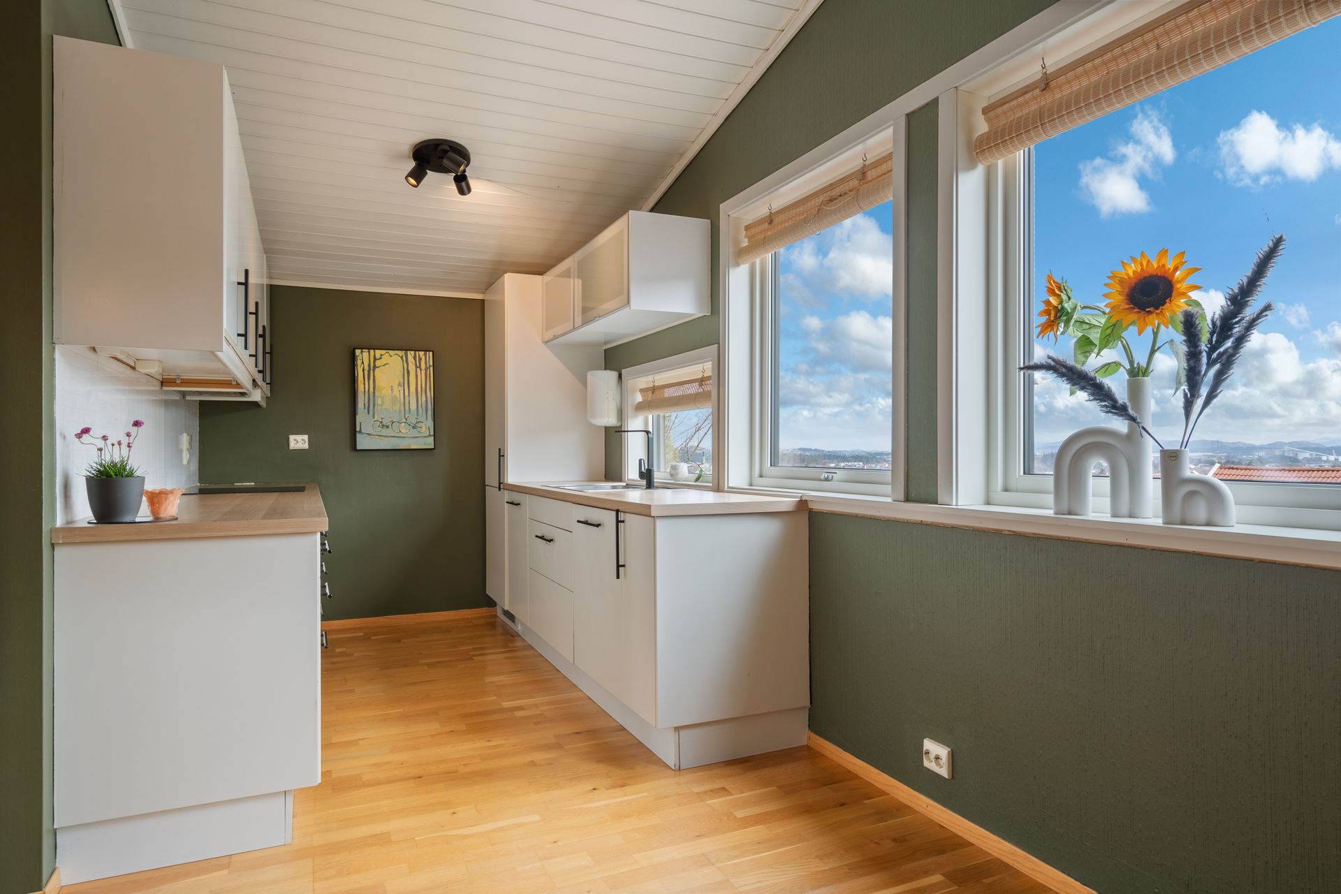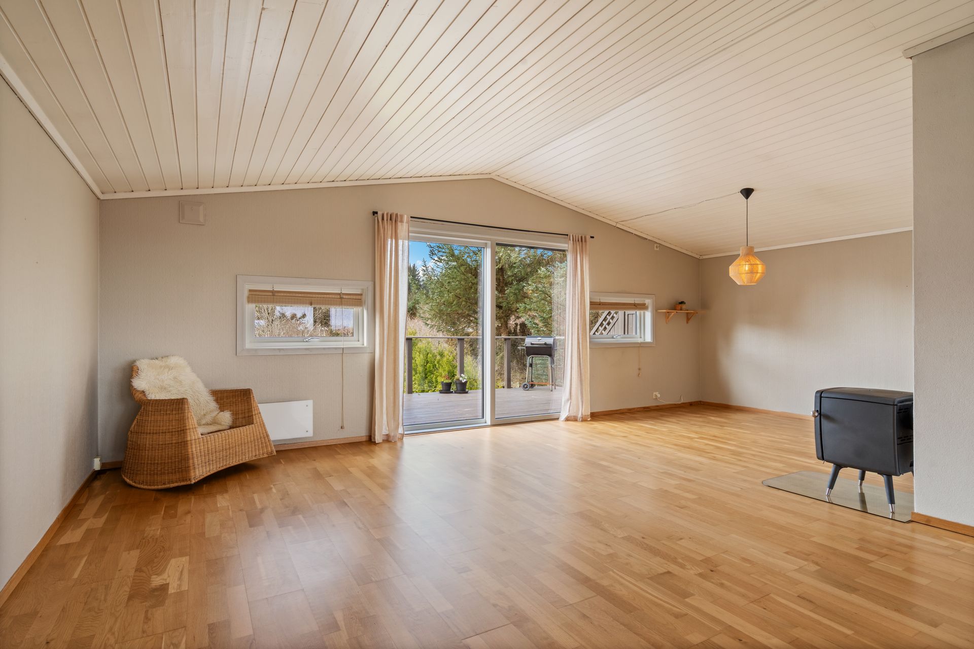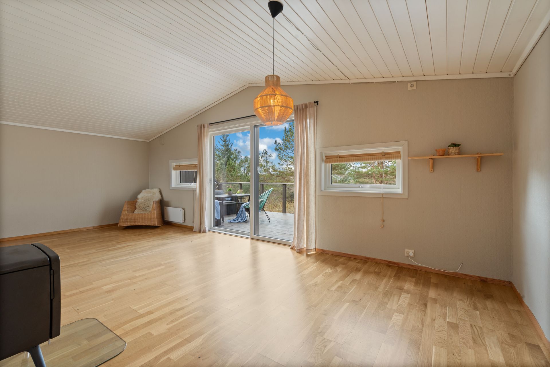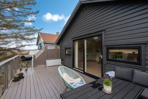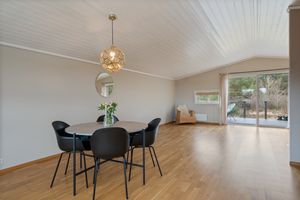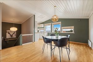 Andre etasje: -Romslig rom med åpen løsning og mønet tak for en god romfølelse. Nydelig sjøutsikt fra kjøkken sonen, og en herlig ro på baksiden med naturlige omgivelser. Fantastisk plass å nyte sola. Tidløs kjøkkeninnredning med integrerte hvitevarer.