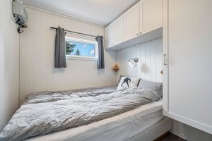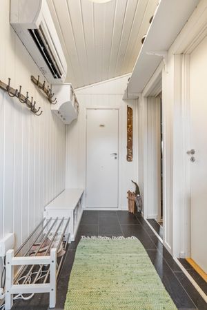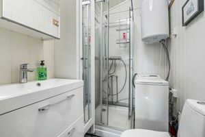 - Bad har våtromsbelegg på gulv og trepanel på vegg. Rommet inneholder seksjon med servant, tett dusjkabinett, toalett på sokkel, opplegg for vaskemaskin og varmtvannstank. Rommet er ventilert med elektrisk vifte. Varmtvannstanken er lekkasjesikret.