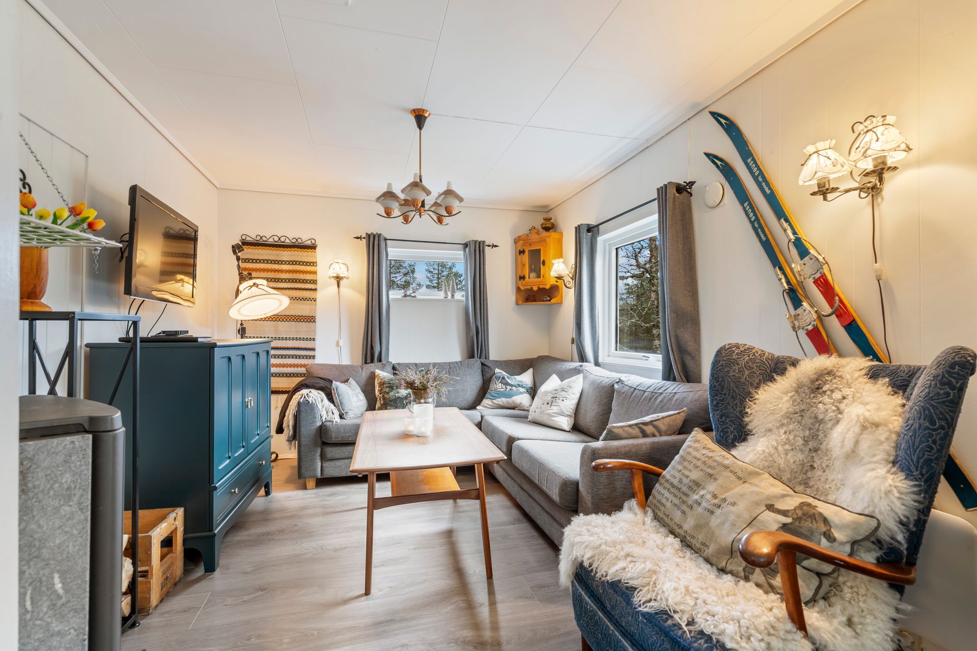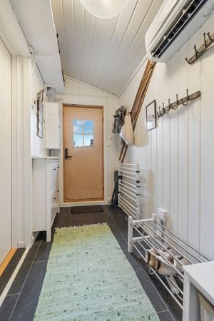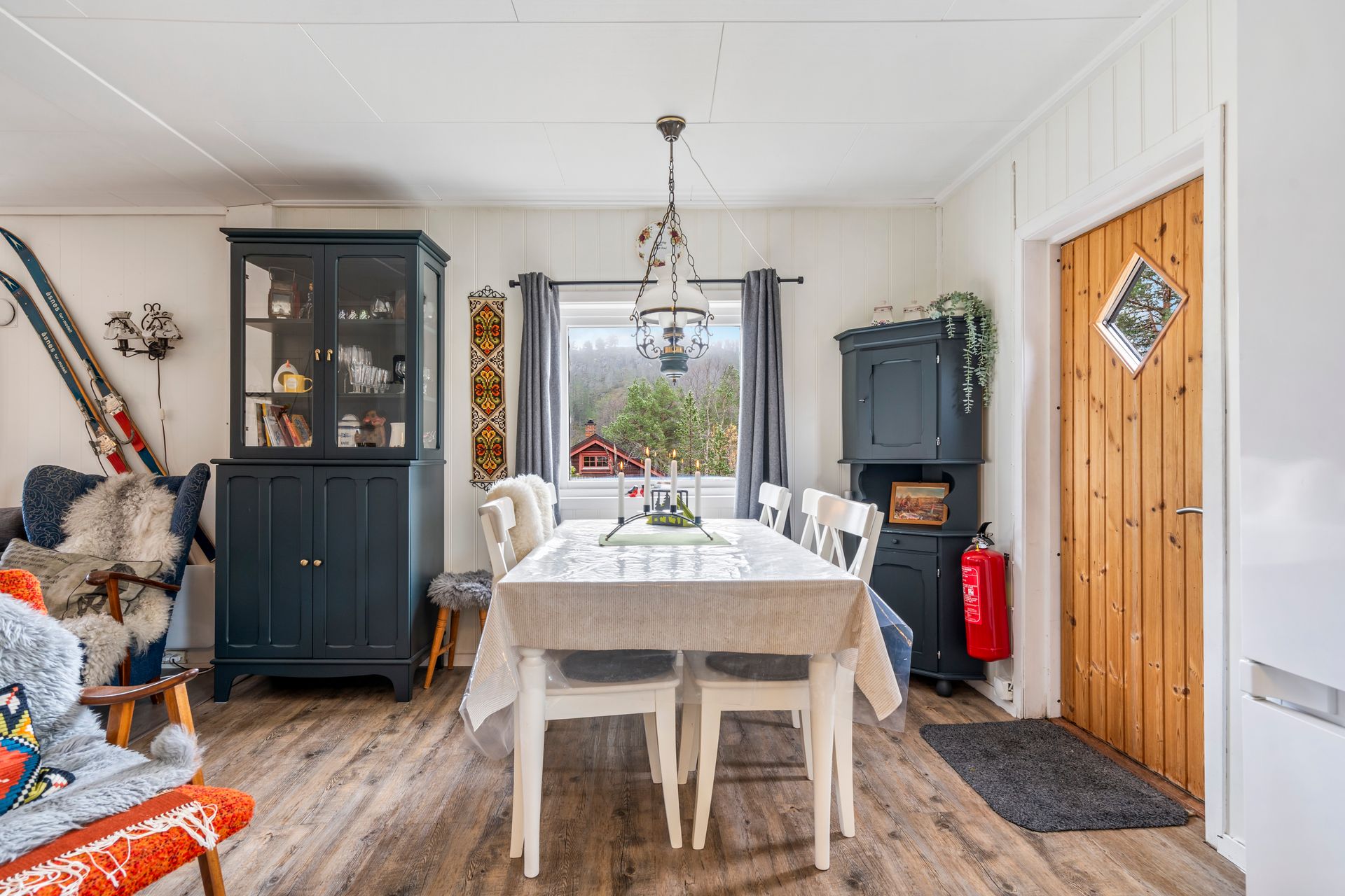 - Innvendige vegger hovedsaklig med trepanel og malte overflater.