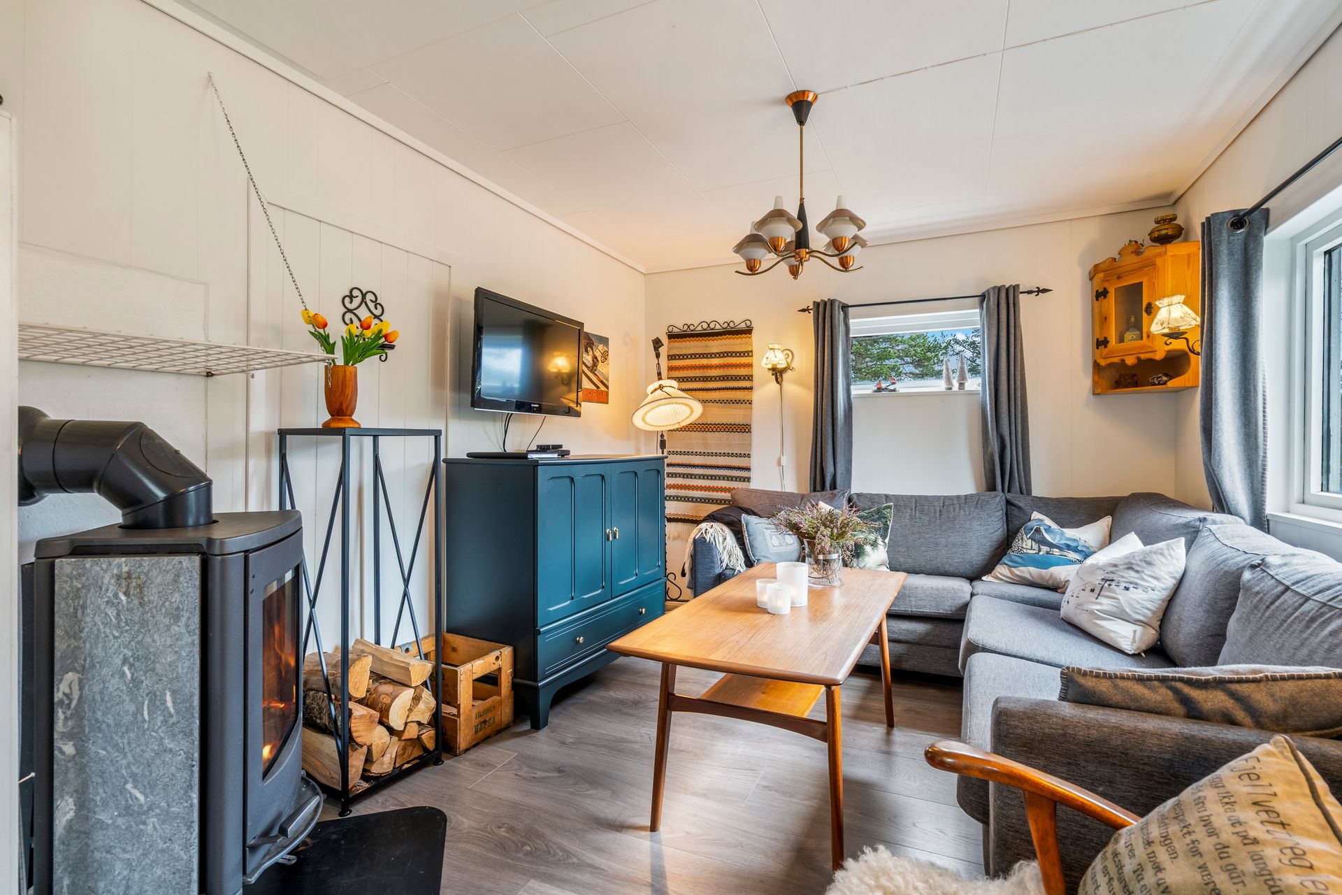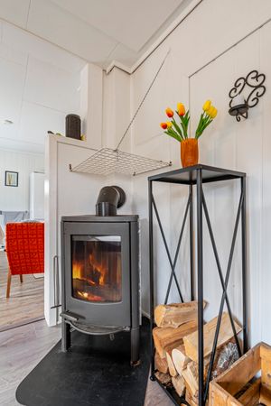 Vedovn i stue. Varmepumpe. Elektrisk oppvarming. I de rom hvor det på visning ikke er montert panelovner, vil det heller ikke medfølge i handelen.
