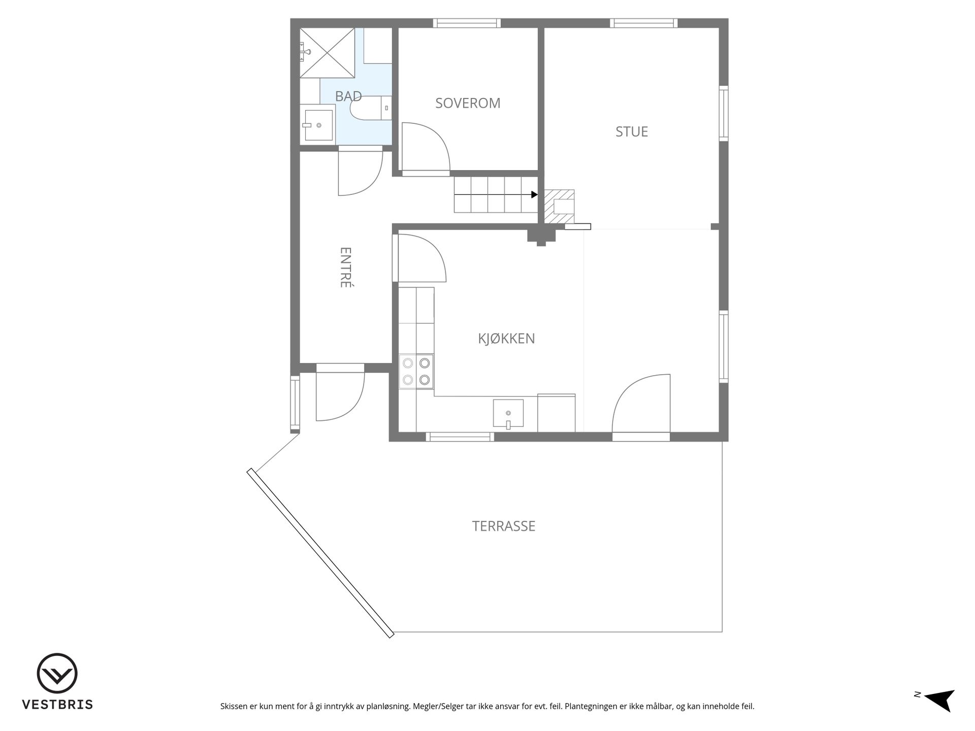 - Etg.: Stue/kjøkken med utg. terrasse, gang, bad og soverom.