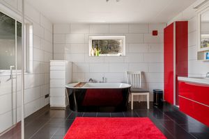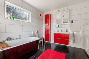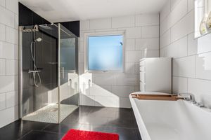 Bad 1. etasje: Stort og romslig hovedbad fra ca. 2016. Rommet inneholder badekar, dusjnisje med glassvegg og seksjon med servant. Ventilasjon skjer via elektrisk vifte i vegg. Det er ingen tilluft under dørblad. Innvendig dør står innenfor våtsone, men er delvis beskyttet av glassvegg.