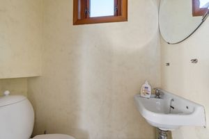 Toalettrom: Ligger vegg i vegg med hovedbad og har enkel standard med toalett og servant.