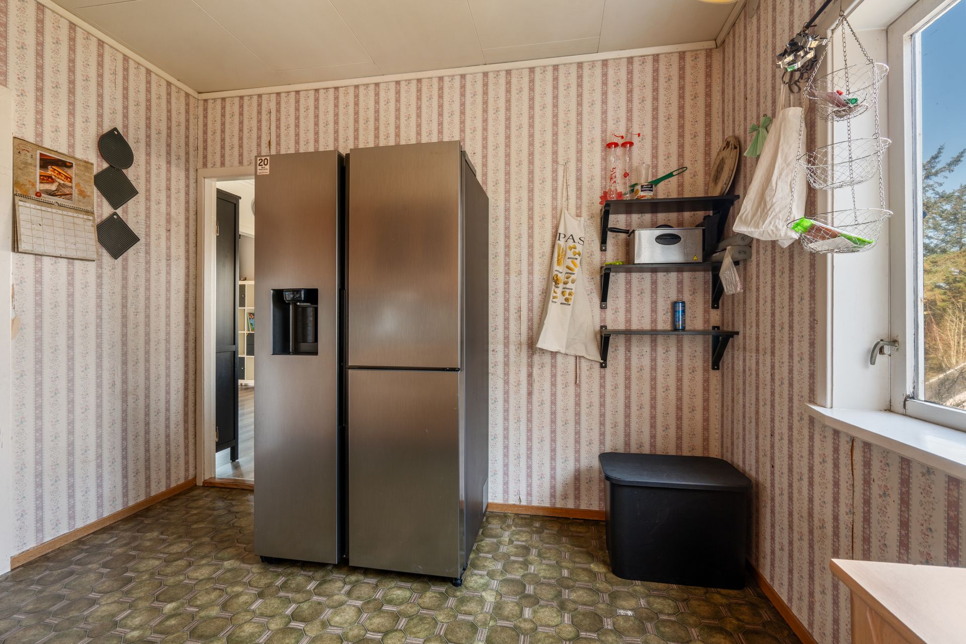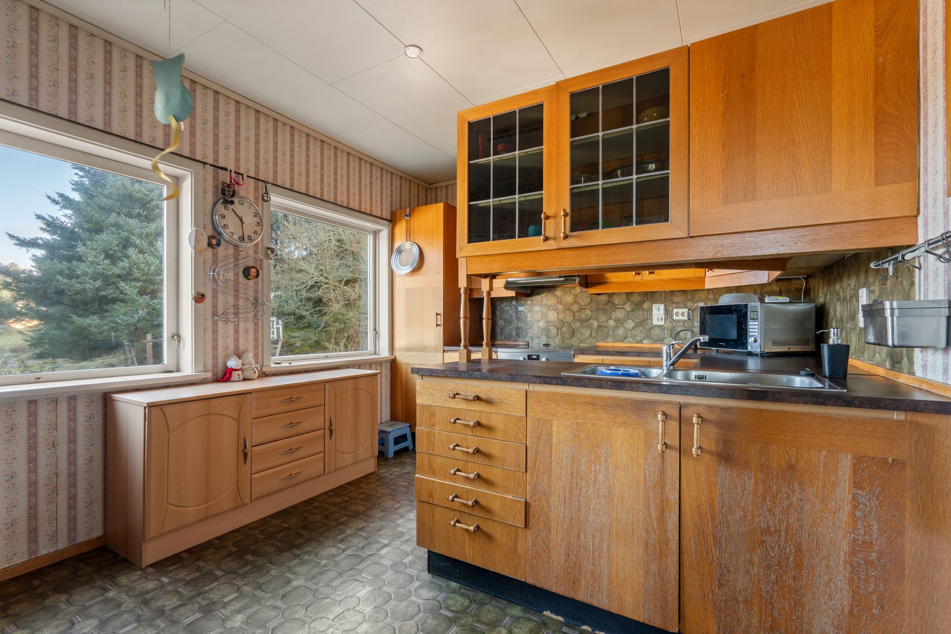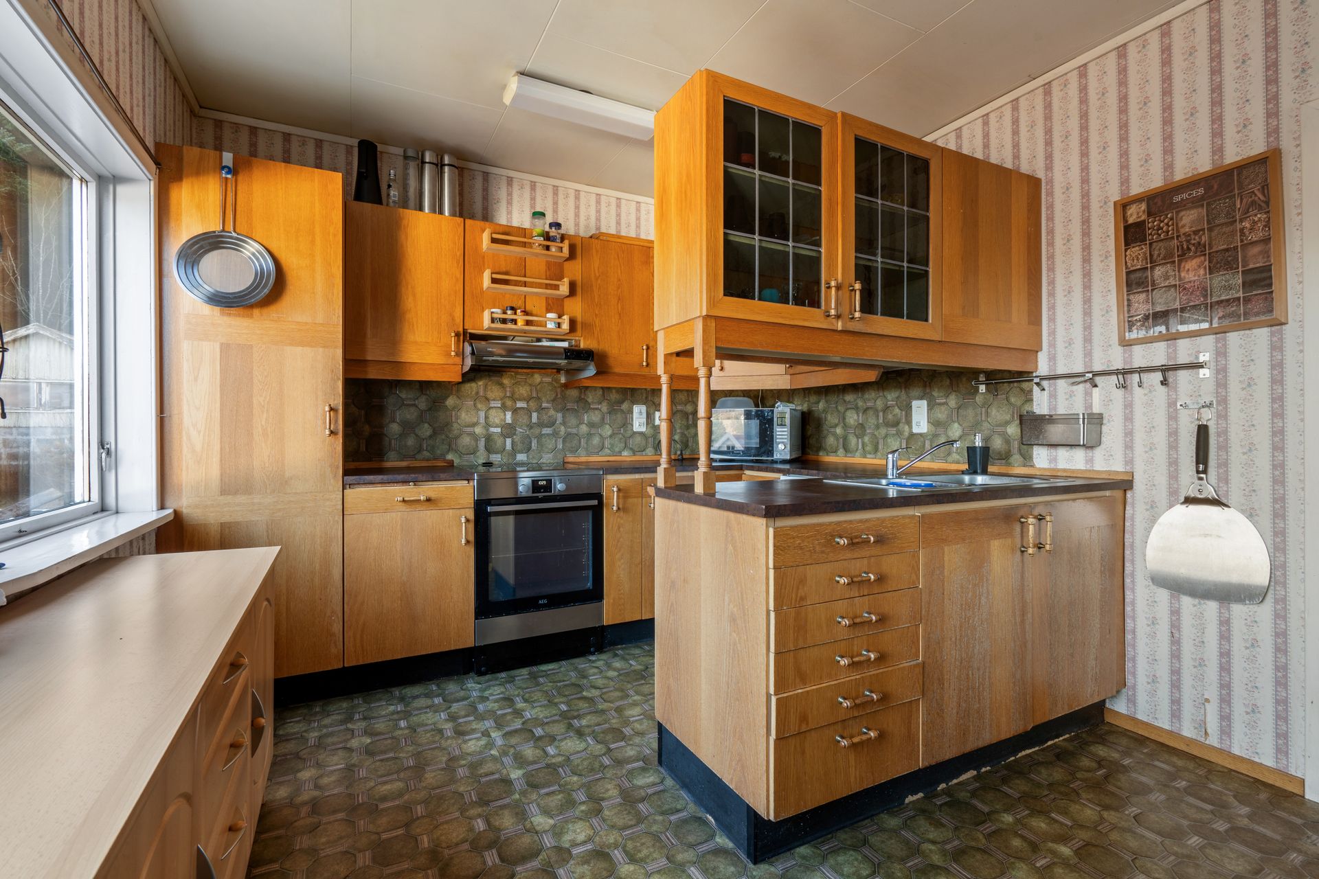 Kjøkken: Romslig kjøkken med eldre prefabrikert innredning med benkeplate i laminat. Det er servant med blandebatteri. Innredningen fremstår som hel og i god bruksstand. Det er utført fuktkontroll med fuktindikator i områder hvor det normalt kan forekomme fuktvandring, herunder i underskap under vask, rundt oppvaskmaskin og på gulv ved sokkellist. Det ble ikke registrert unormale fuktverdier. Det er observert enkelte avvik i skjøter på benkeplaten. Hvitevarer på kjøkken medfølger salget.