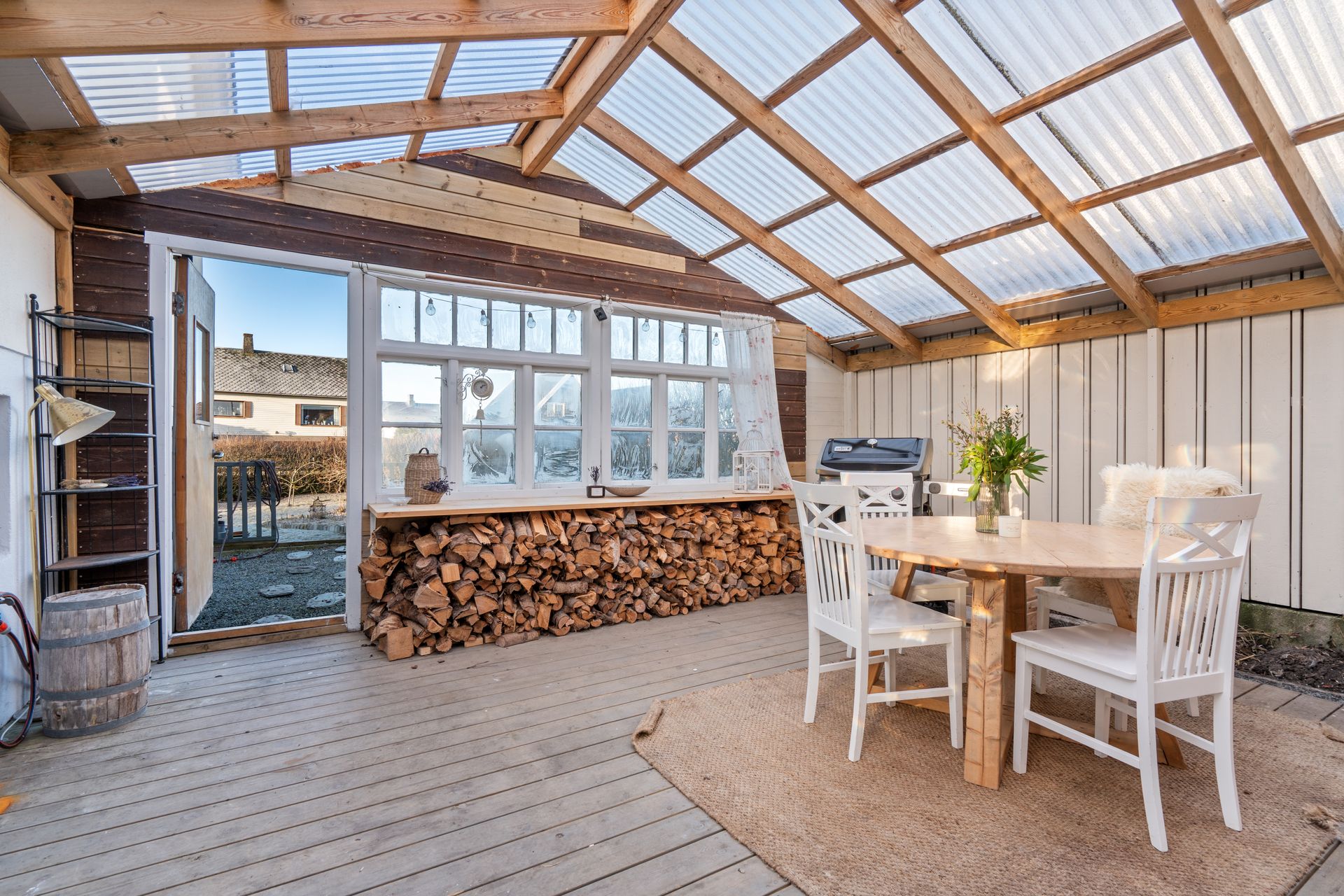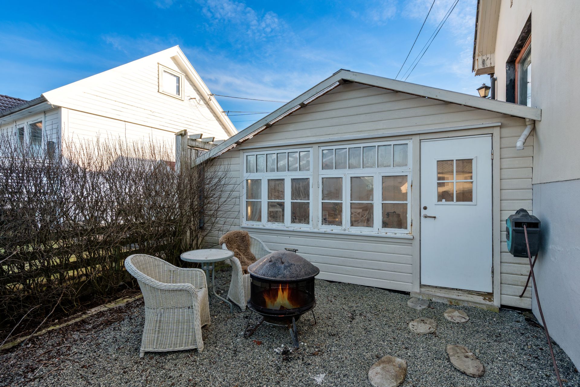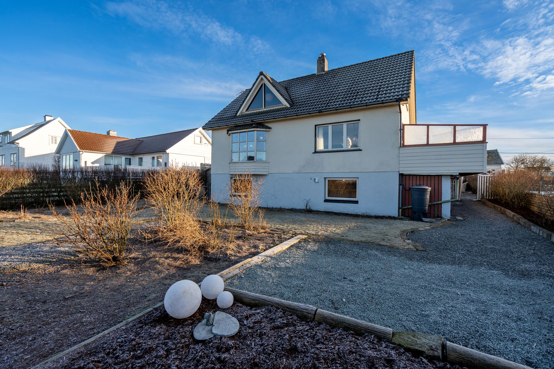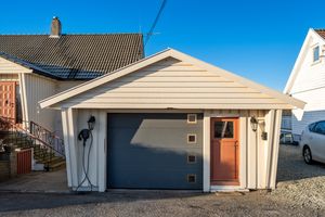 Utvendig: Garasje: Garasjen er i enkel standard, men har elektrisk port og oppbevaringsloft. Drivhus. Hagestue. (Hagestue er ikke byggemeldt/søkt om)