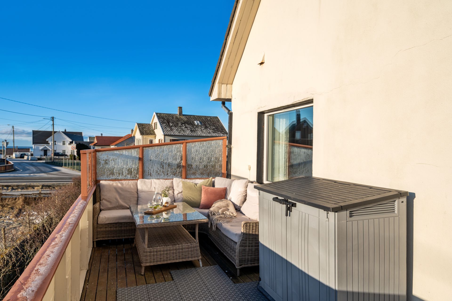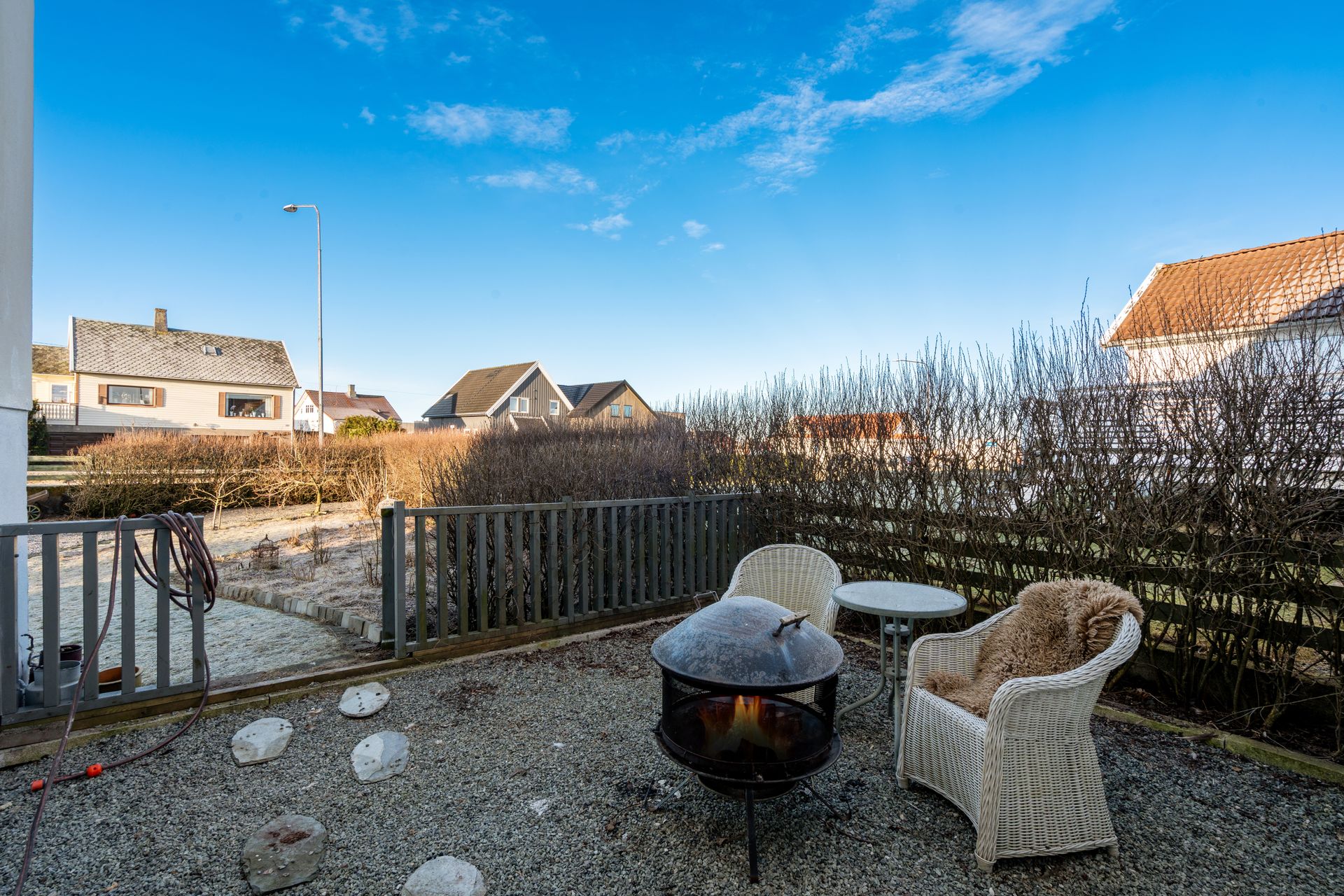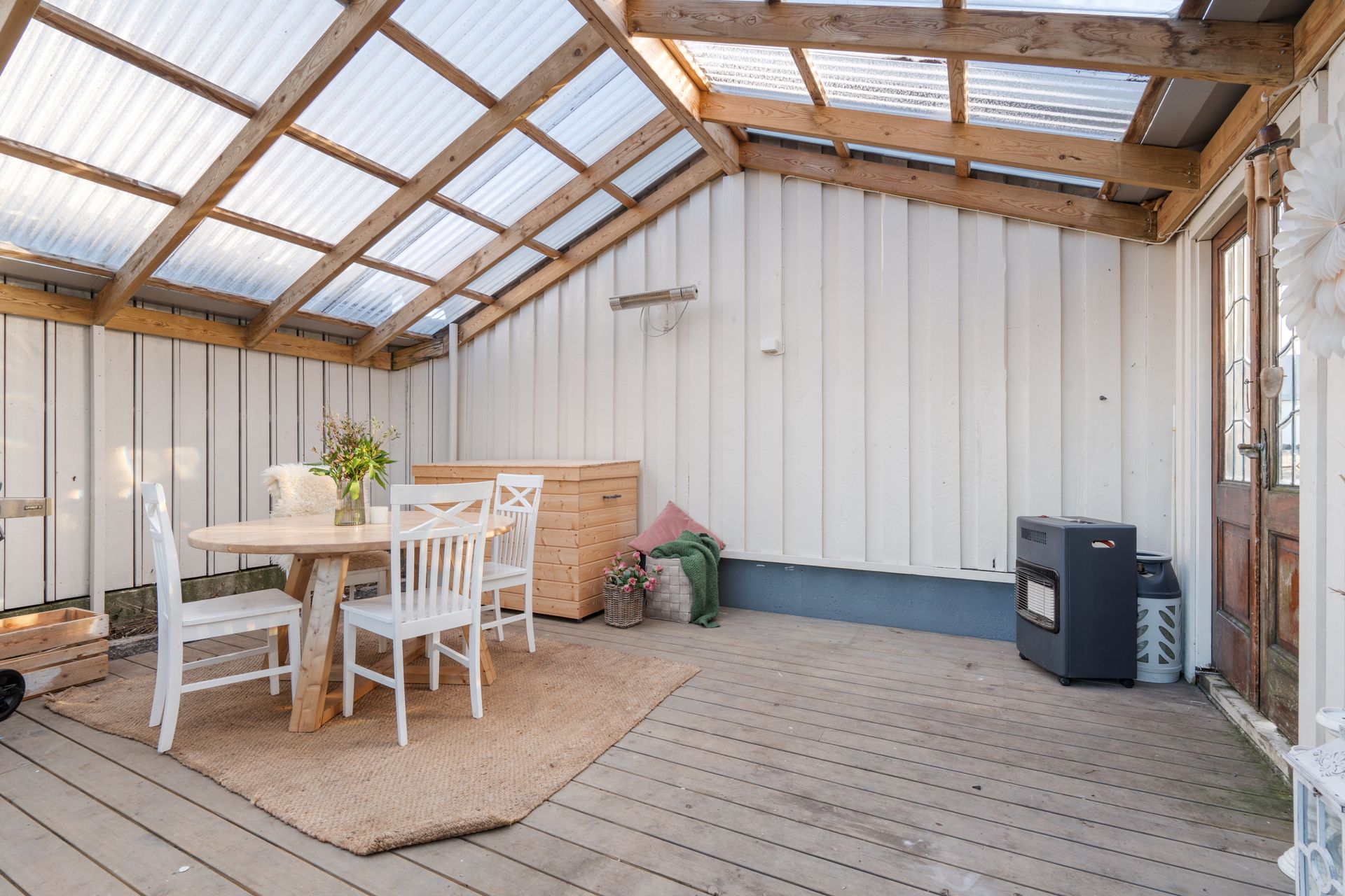Utvendig: Garasje: Garasjen er i enkel standard, men har elektrisk port og oppbevaringsloft. Drivhus. Hagestue. (Hagestue er ikke byggemeldt/søkt om)
