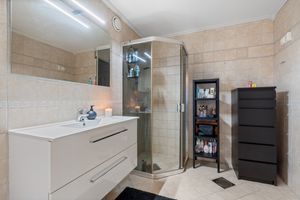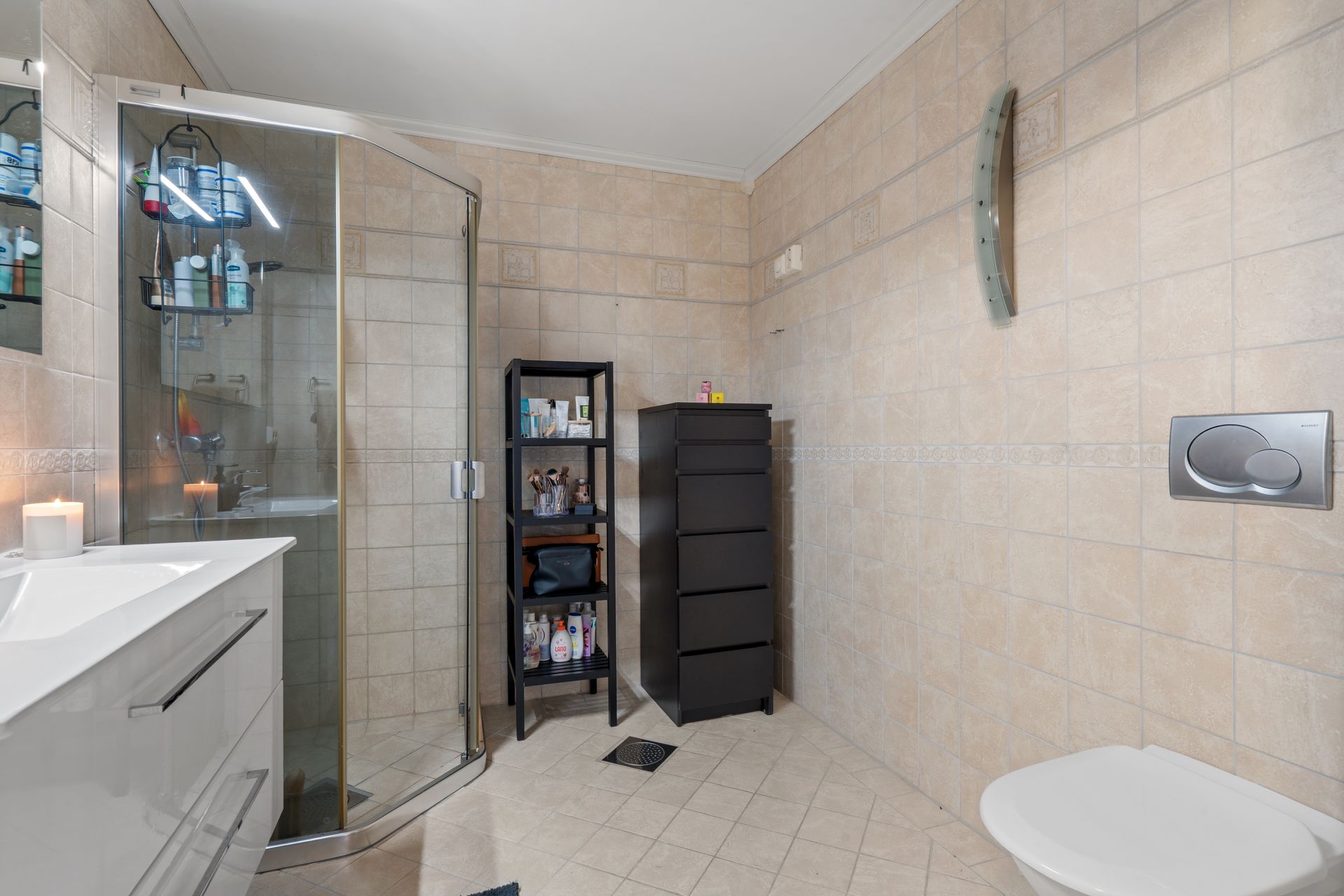 Badet er romslig og lekkert flislagt. Vegghengt toalett og baderomsinnredning, samt varmekabler i gulvet for ekstra komfort.