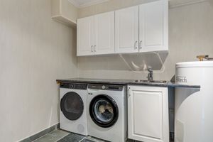 I tillegg har boligen et praktisk og romslig vaskerom med skiferfliser, arbeidsbenk, god skapplass, opplegg for vaskemaskin og tørketrommel.