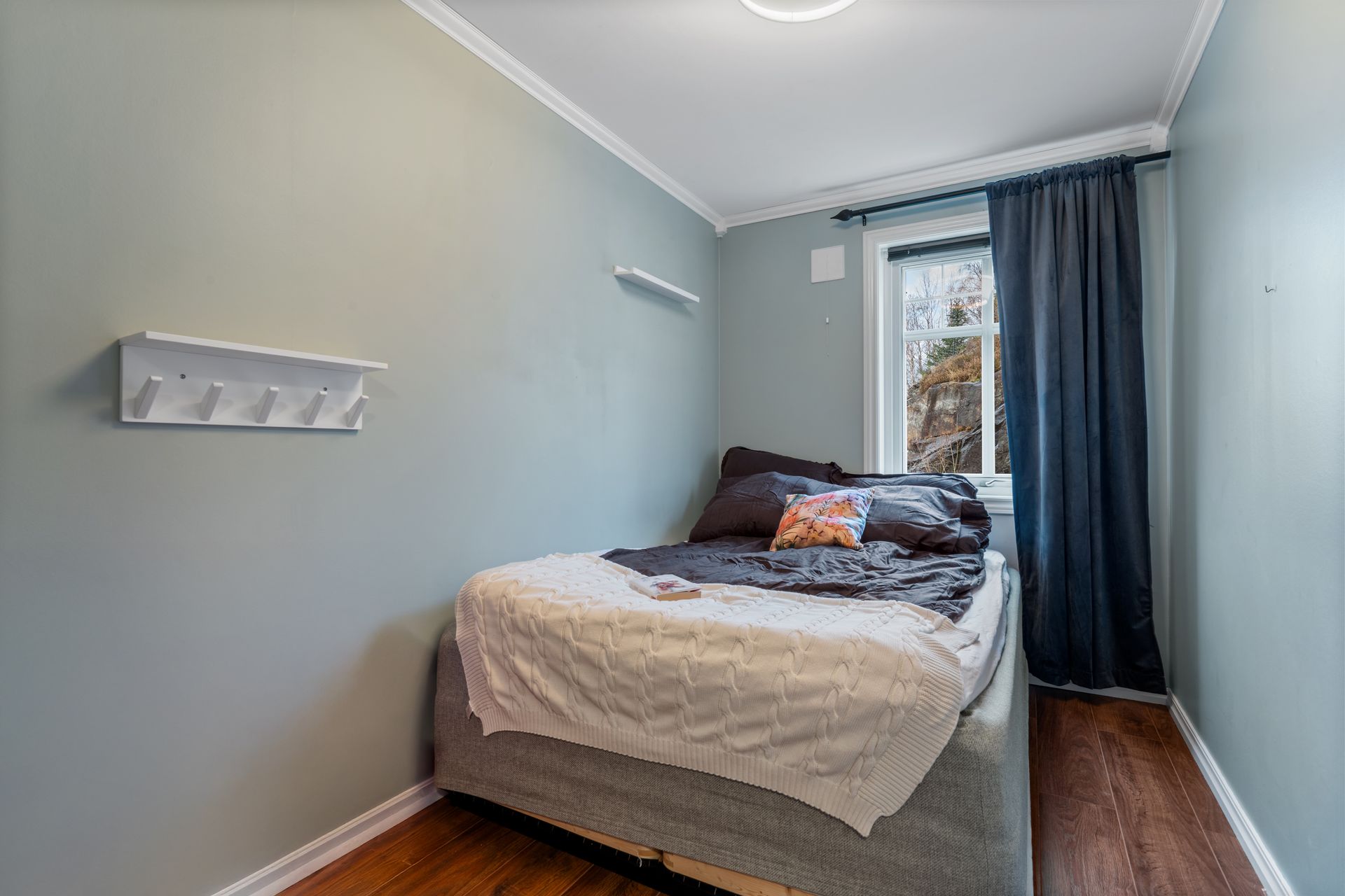 Leiligheten har to soverom, hvorav hovedsoverommet er utstyrt med skyvedørsgarderobe. Veggene er i delikate farger, og det er laminatgulv i stue, kjøkken, gang og soverom. Flott profilerte listverk og innerdører gir et gjennomført og tidløst preg.