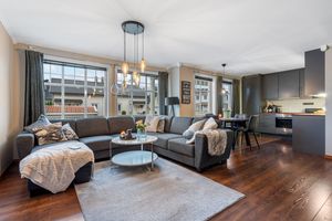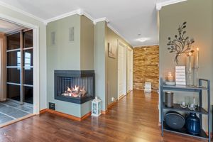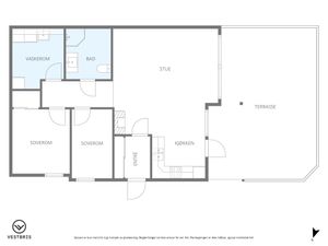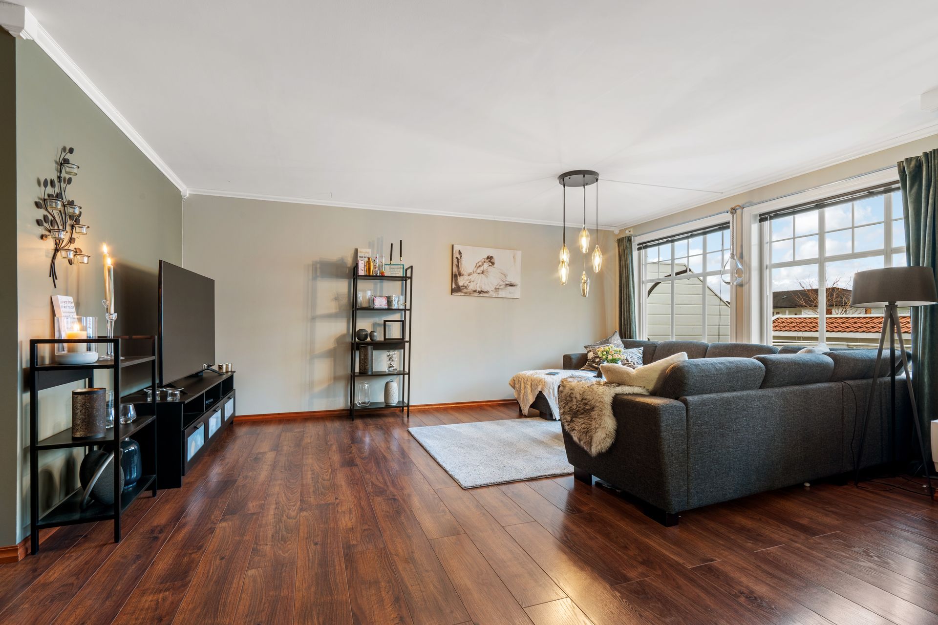 Stuen er lys og trivelig, med åpen kjøkkenløsning og gasspeis som skaper en lun atmosfære. I tillegg er det montert vrmepumpe som sørger for jevn varme i leiligheten. Fra stuen er det utgang til en stor, solrik og flisbelagt terrasse - perfekt for rolige stunder eller sosiale sammenkomster.