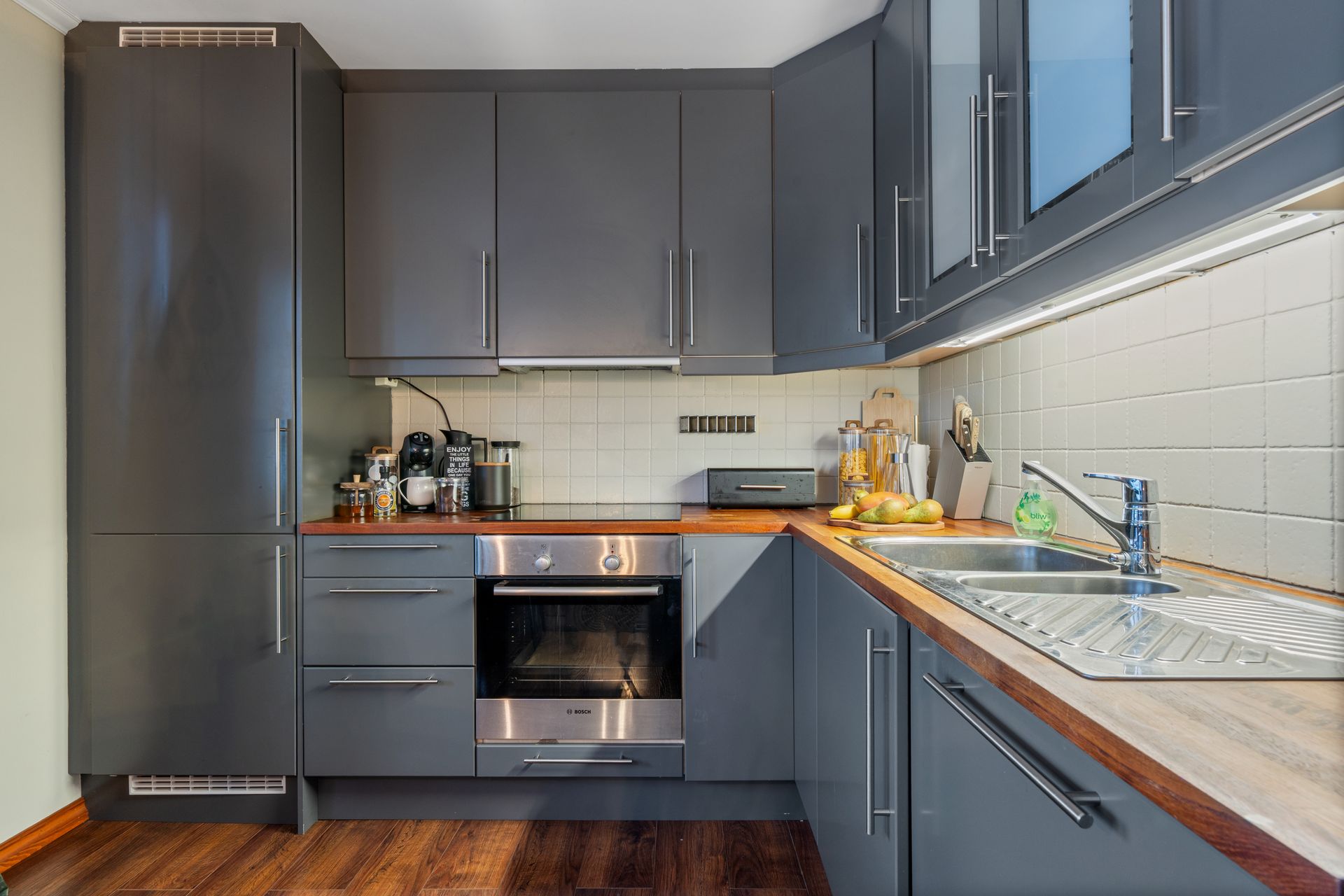 Kjøkkenet fra Norema fremstår stilig og funksjonelt, med fliser over benken, heltre teak benkeplate, avtrekksvifte og integrerte hvitevarer som komfyr, oppvaskmaskin og kjøleskap med frysedel.