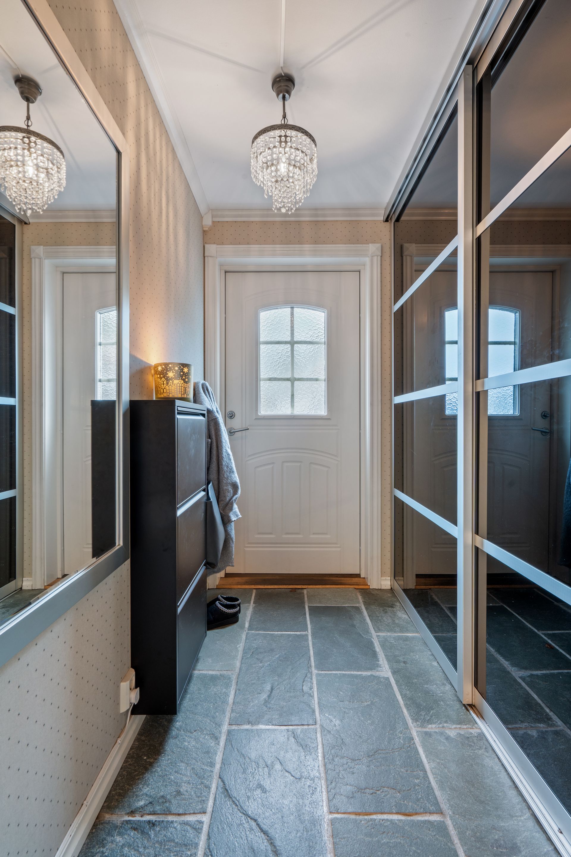 Entreen er innbydende, med skiferfliser på gulvet og praktisk skyvedørsgarderobe som gir rikelig med oppbevaringsplass.