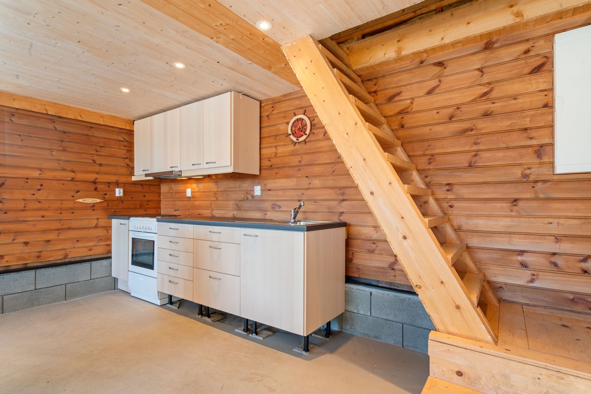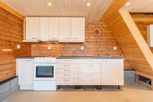 Naustrom: Naustrom med kjøkkeninnredning i bakkant under trappa som går opp til bøteloftet. Tre vinduer i naustrommet samt støpt gulv.
