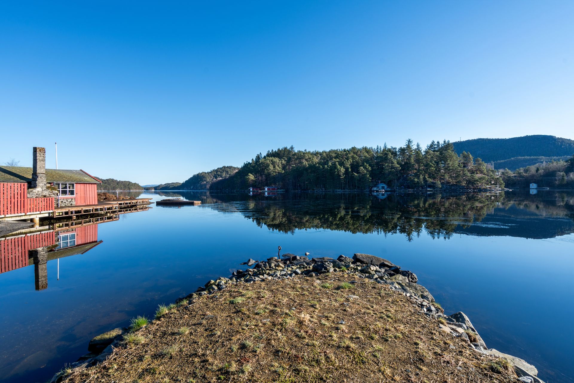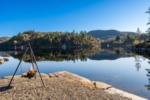 Eiendommen har en spektakulær beliggenhet med en nydelig utsikt utover Rødspollen og utover Førdespollen. Skjermet beliggenhet i forhold til naboer lite innsyn. Fin skjærgård, lite vind når det stormer og blåser i området forøvrig.
