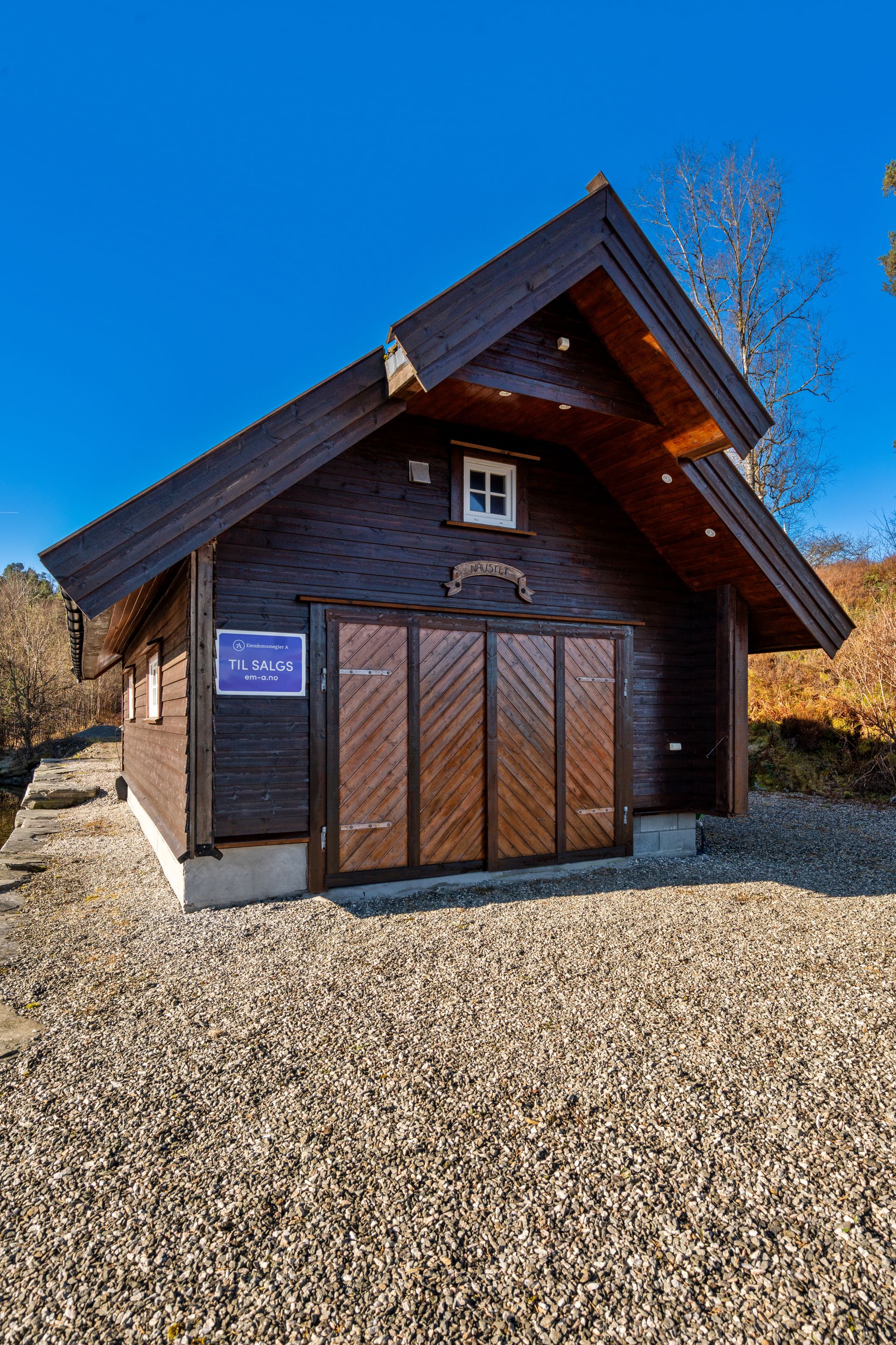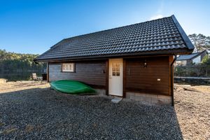 - Naust har vinduer i PVC, ytterdør i tre, foldedør i tre i front og sidedørsinngang.