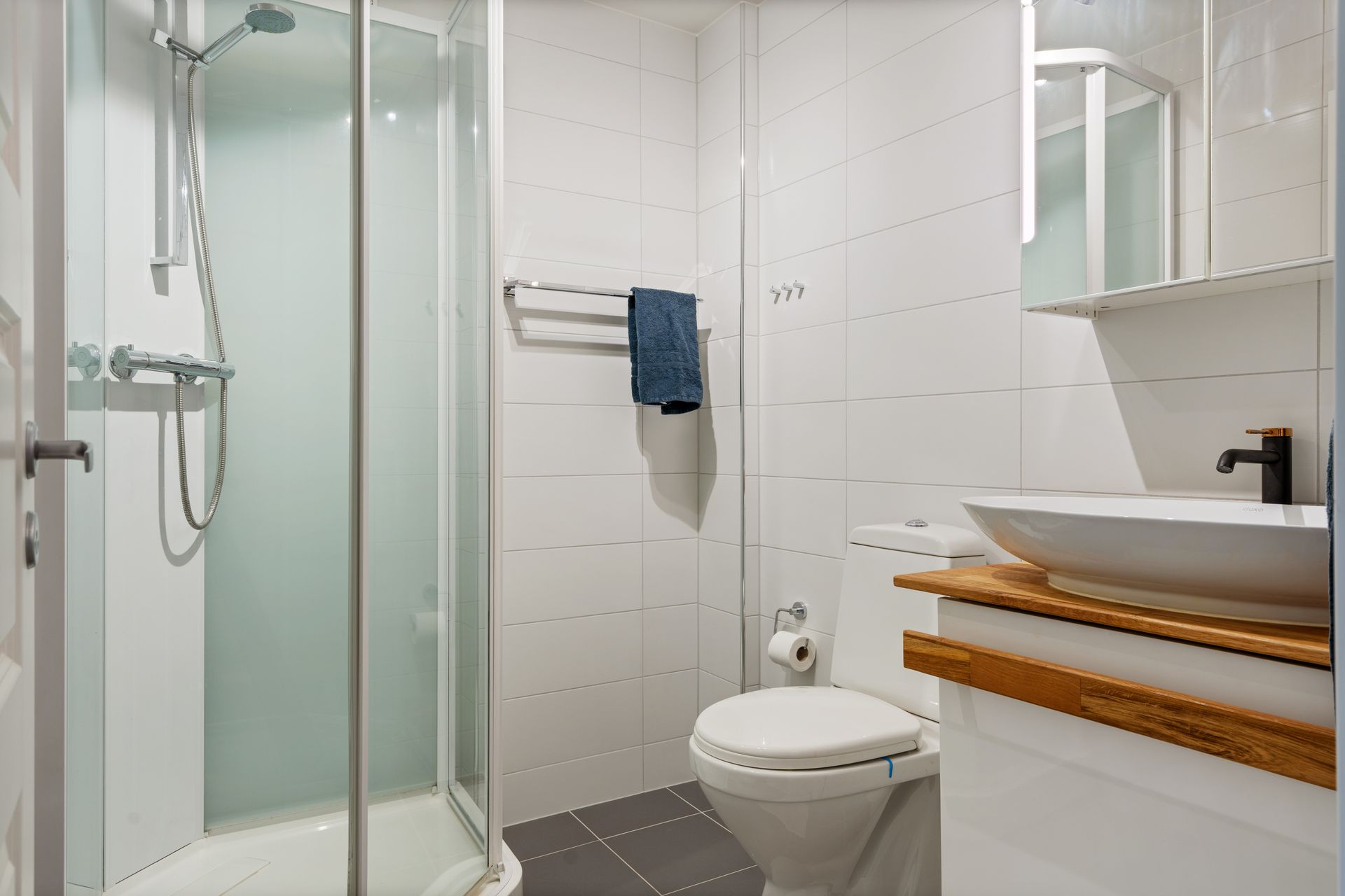 1.1.1 Bad Overflate vegger og himling TG2- Baderommet vurderes til TG2 grunnet avvikende plassering av dør i våtsone, delvis skjult avtrekksvifte og rommets alder. Ingen tegn til lekkasje eller fuktproblemer ble registrert ved befaring.
