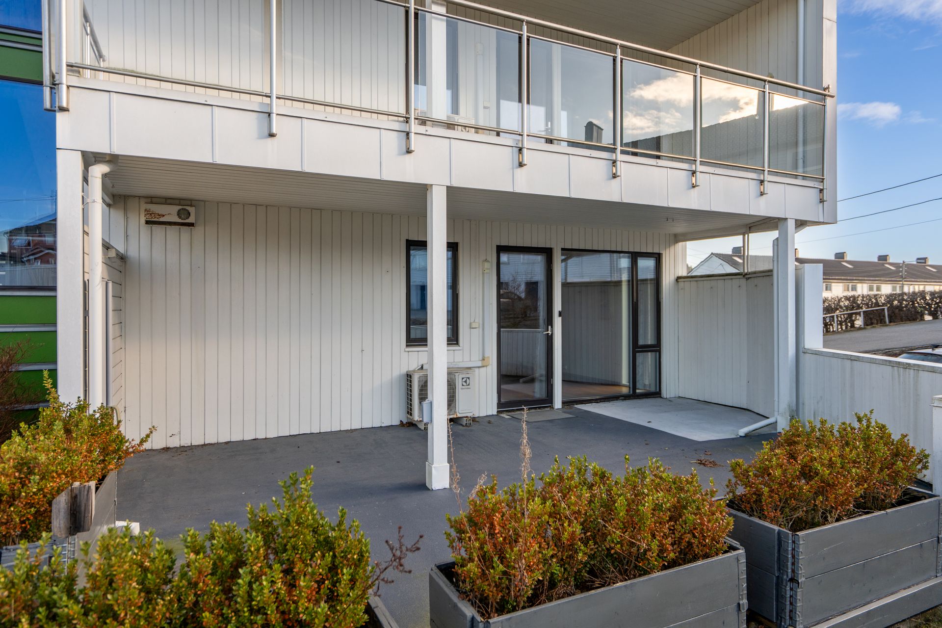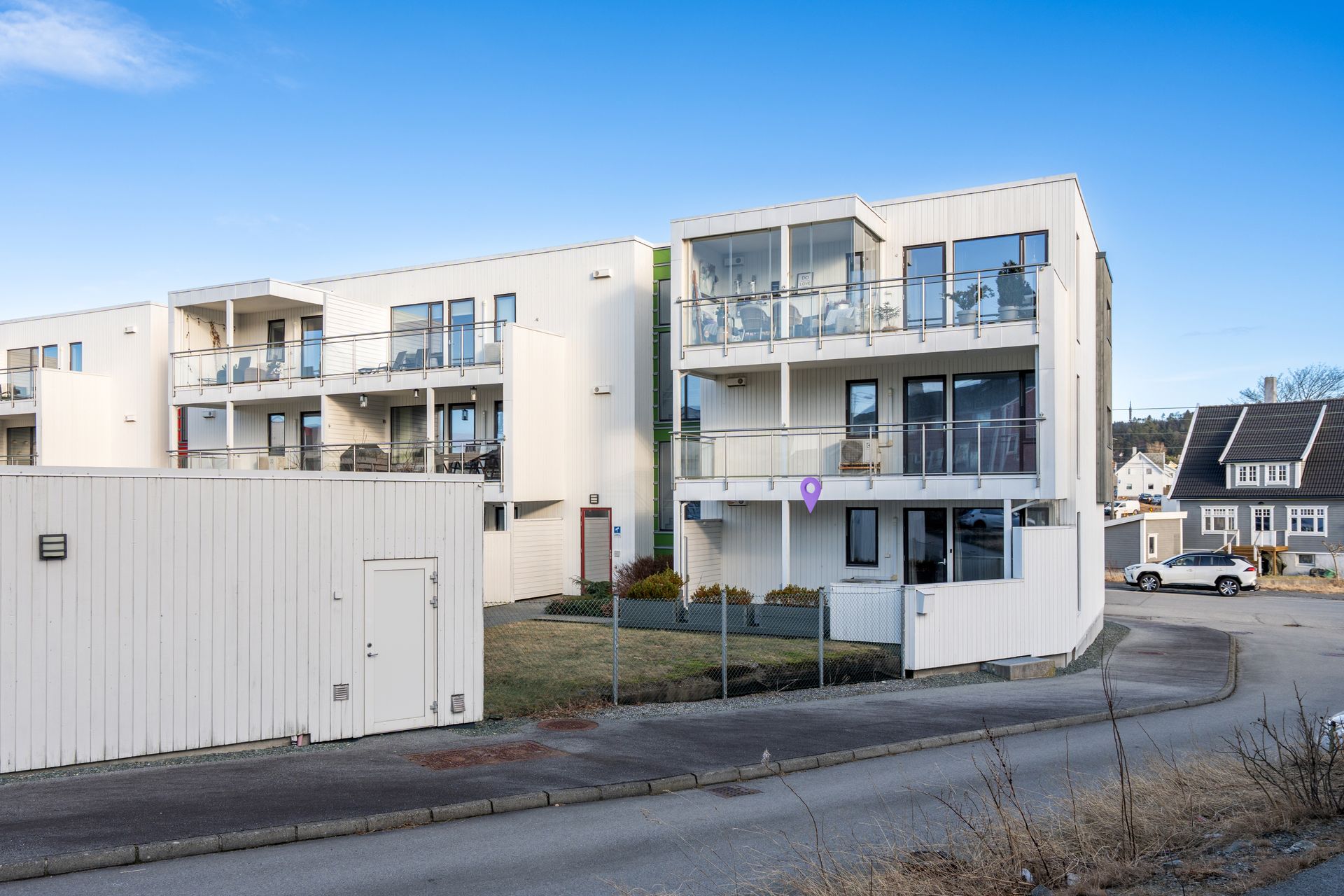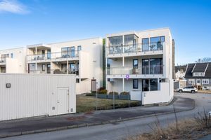 Leiligheten ligger i første etasje i bygget lengst sør i Grindesvingen.