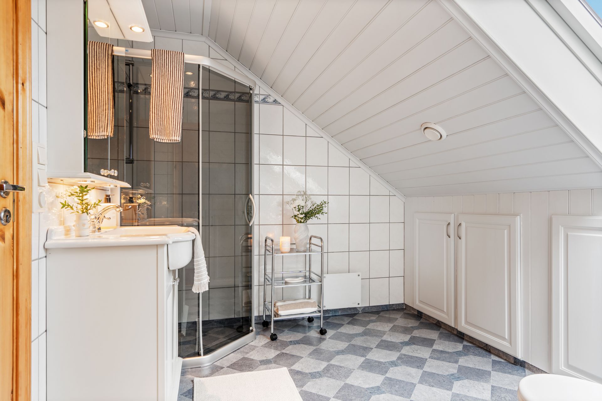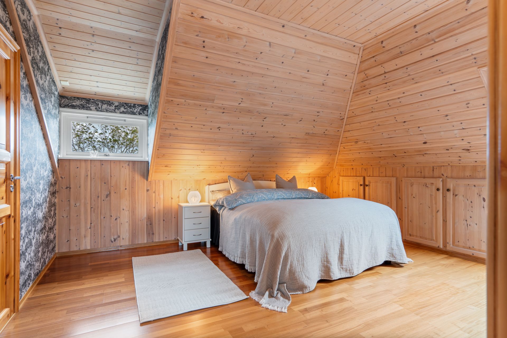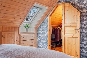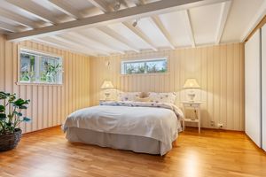 Loftsetasje: -Svært romslig hovedsoverom med deilig takhøyde og god plass til stor dobbeltseng og øvrig møblement. Plassbygde hyller og skuffer. I forbindelse med hovedsoverommet er det walk-in closet. Nyere vinduer i dette rom. -Soverom nummer 2 i god størrelse, perfekt som barnerom/gjesterom. -Bad med tilkomst fra begge soverom. Badet er lyst og fint med takvindu som slipper inn naturlig dagslys. Badet inneholder dusj hjørne, toalett og servantskap. -Gode oppbevaringsmuligheter og et stort kott over vindfanget.